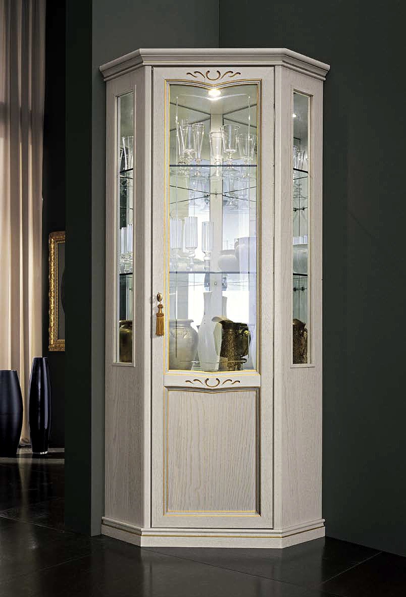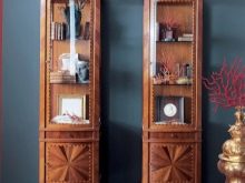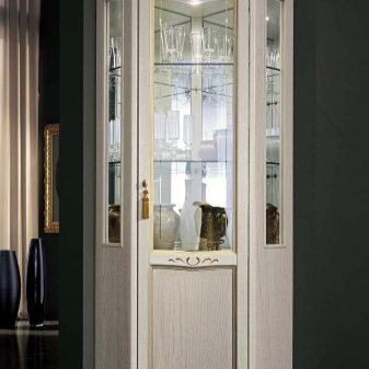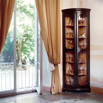 - Eckmodelle Vitrinen sind kompakt und mobil. Das Design ermöglicht es Ihnen, die Möbel in die Ecke eines Raumes zu stellen, ohne zusätzlichen Platz zu beanspruchen. In der Regel sind diese Schränke dekorativ und dienen zur Aufbewahrung von Büchern, Fotografien und Souvenirs. Im Kinderzimmer dient der Schrank als Ablage für kleine Spielsachen und Sammlungen.