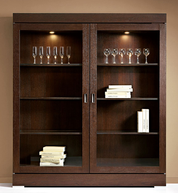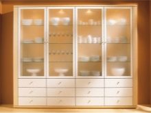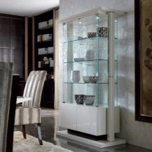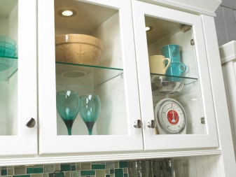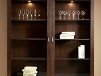 Einige Modelle von Schränken mit Glas in der Herstellung von belieferten Beleuchtungssystemen. Es kann Punkttyp oder Band sein. Ein solcher Umzug verleiht der Möbel Originalität aufgrund des Spiels von Licht. Darüber hinaus können Sie sich auf den Inhalt des Gehäuses konzentrieren.