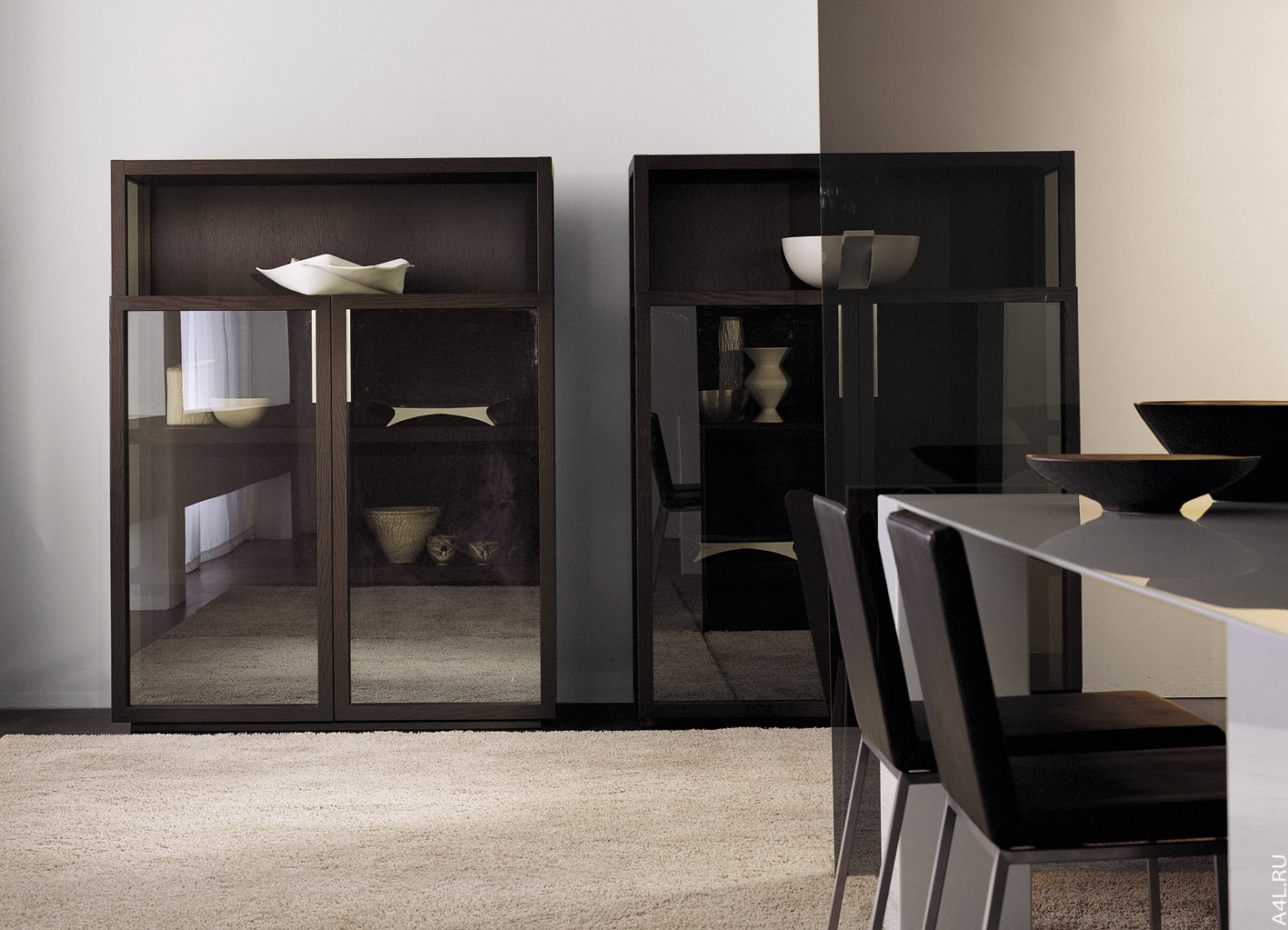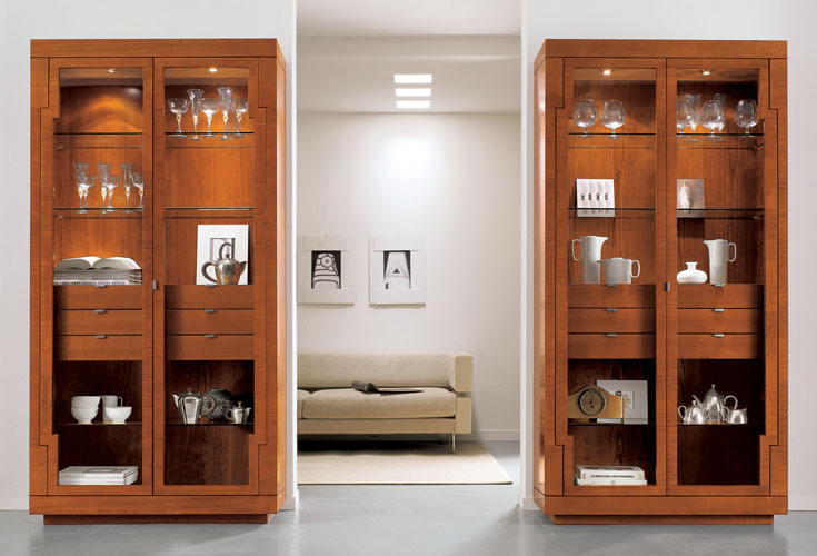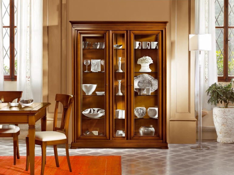 Schränke mit Glastüren sind normalerweise mit einer spiegelartigen Innenfläche versehen, wodurch der Raum optisch erweitert wird. Dies gilt für kleine Räume (z. B. Klassenräume) oder in Anwesenheit einer Heimbibliothek.