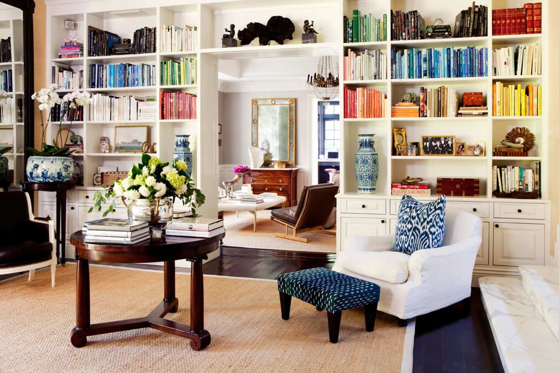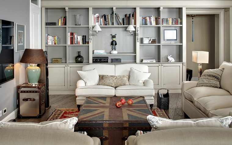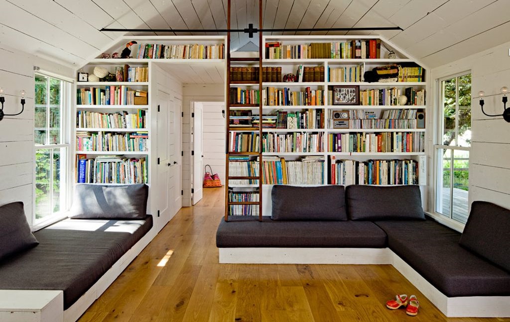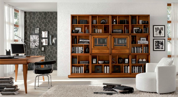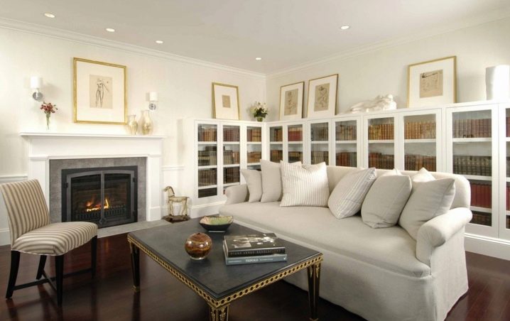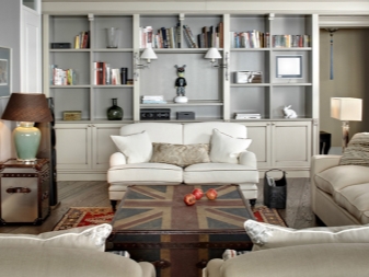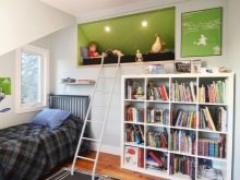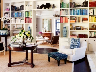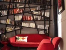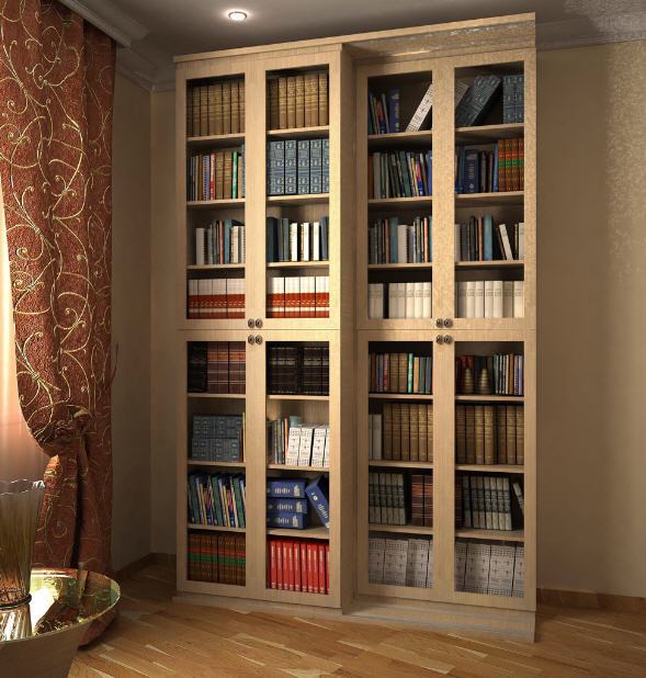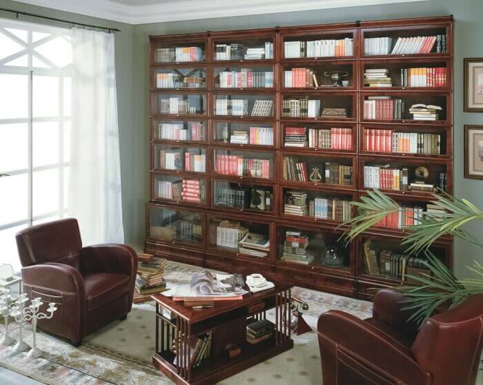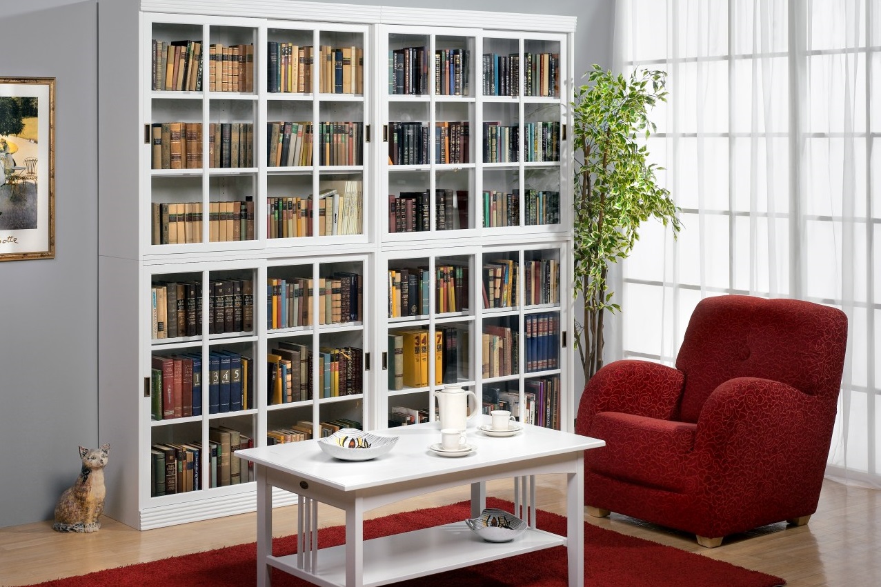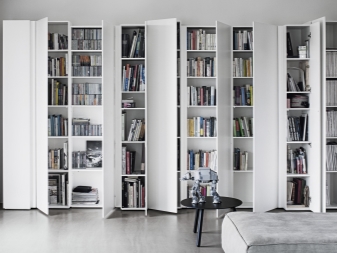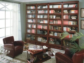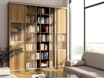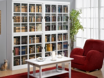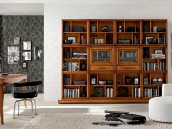 Die hölzernen flachen Schränke-Gestelle werden in der Form der Rutsche gemacht, dabei die Fähigkeit erleichternd, das eine oder andere Objekt zu bekommen. Sie sind niedrig, haben aber viele Regale und Trennwände. Sie dienen nicht nur der Aufbewahrung von Büchern, sondern auch von verschiedenen Figuren oder dekorativen Kleinigkeiten.