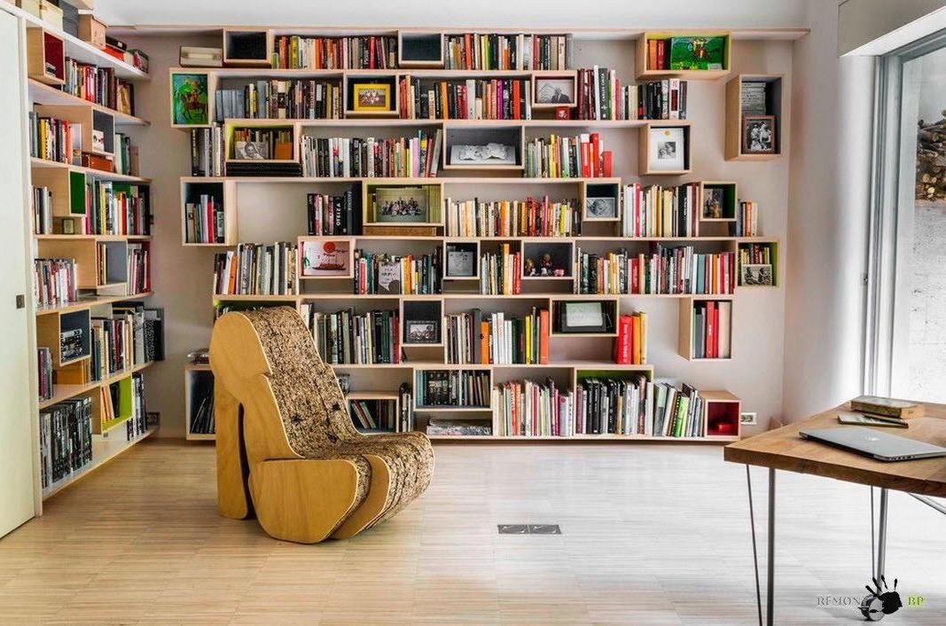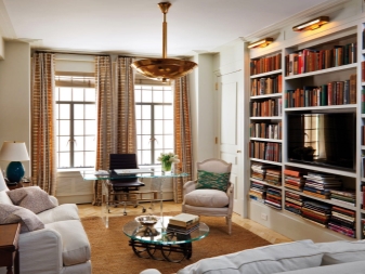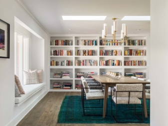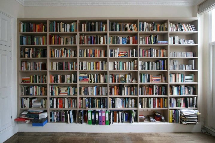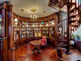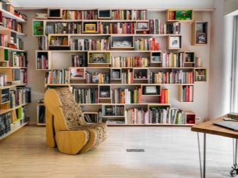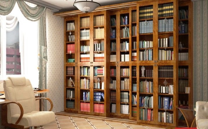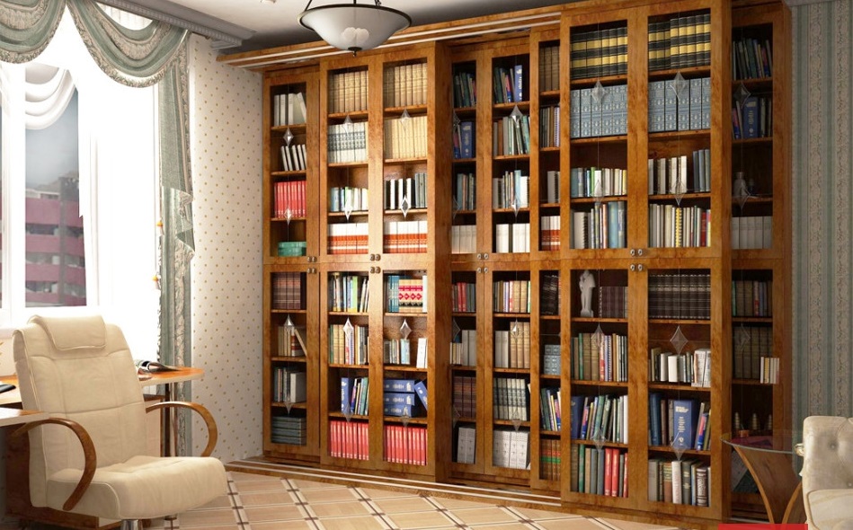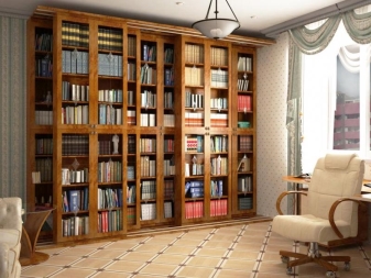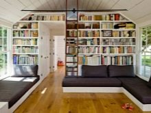 Modelle für die Bibliothek werden nach den Abmessungen des Raumes angefertigt. Sie haben klar definierte Formen und Proportionen, die beim Gebrauch besonderen Komfort schaffen und den Raum mit Komfort erfüllen. Solche Designs bestehen aus Regalen und Trennwänden. Breite, Länge und Tiefe können sehr unterschiedlich sein.