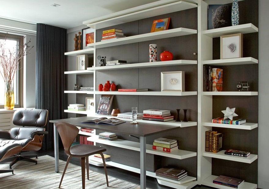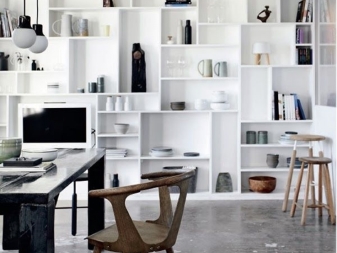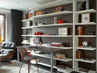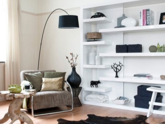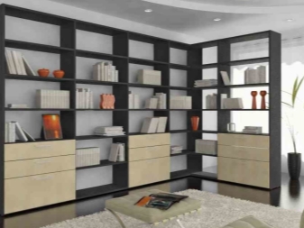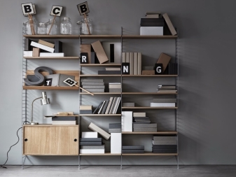 In der Form sind sie gerade, eckig und eingebettet. Wenn der Regallagerschrank eine ungewöhnliche Form und Lage der Regale hat, bedeutet dies, dass er nur für die Aufbewahrung von verschiedenen kleinen Gegenständen und dekorativen Gegenständen gedacht ist. Daher werden Bücher, die auf eine solche Konstruktion gelegt werden, nicht empfohlen.