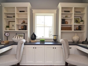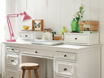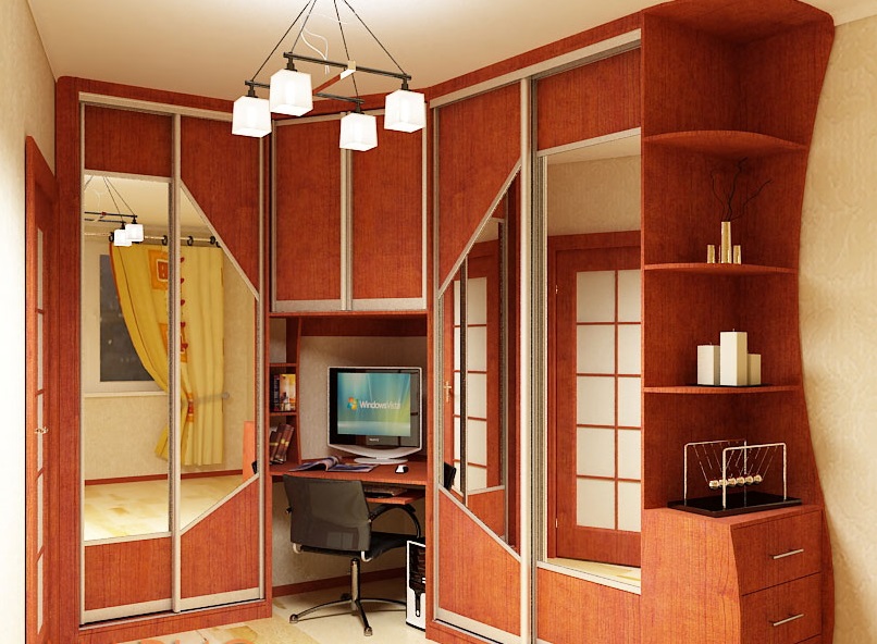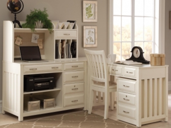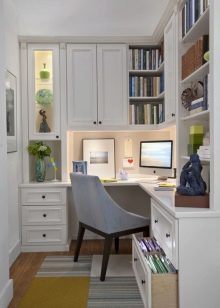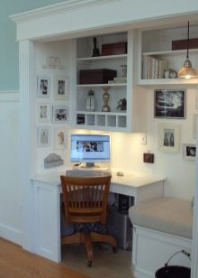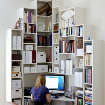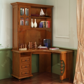 Wenn der Raum im Raum klein ist, ist es besser, die Eckenoptionen zu verwenden. So sparen Sie zusätzlichen Platz. Viele Menschen ziehen es vor, solche Möbel in der Nähe des Fensters zu platzieren. Dies gilt insbesondere, wenn Sie den Schreibtisch für die Arbeit verwenden.