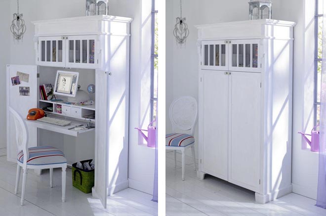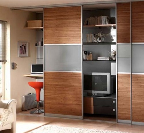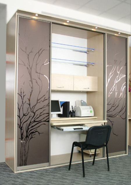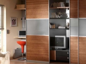 Solche Modelle werden immer Türen haben. Sie können klappbar, unten, Coupé sein. Sie müssen nur die Option auswählen, die am besten in Ihr Zimmer passt. Es kann auch einen einziehbaren Tisch geben. Das Design kann auch ein Schreibtisch-Büro mit einem versteckten Tisch darstellen.