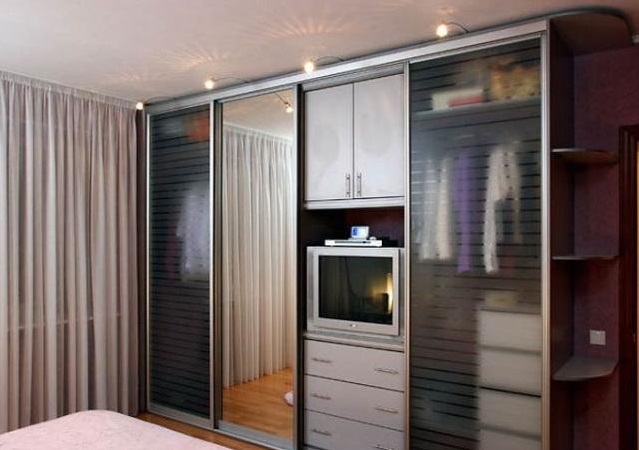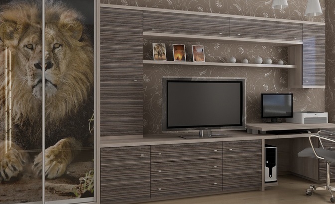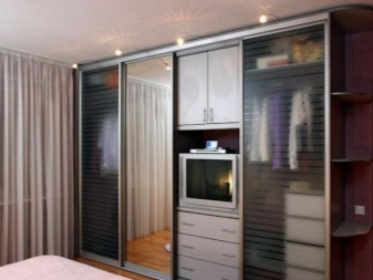 Erhebliche Platzersparnis Solche Optionen sind zwei in einem Produkt. Dies ist ein geräumiger Kleiderschrank, wo Sie alle notwendigen Dinge und Zubehör sowie einen Arbeitsplatz / Stand für einen Fernseher und andere Gegenstände platzieren können. So sparen Sie effektiv Platz in der Wohnung und organisieren den Platz richtig.