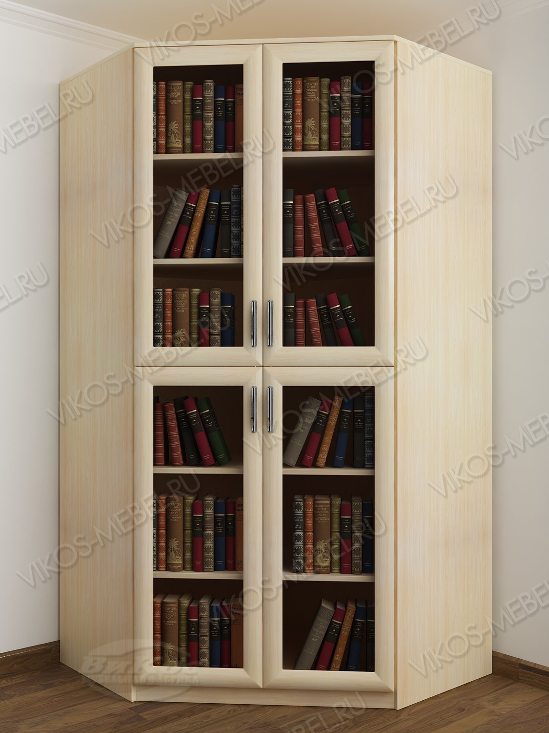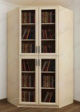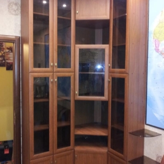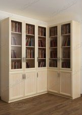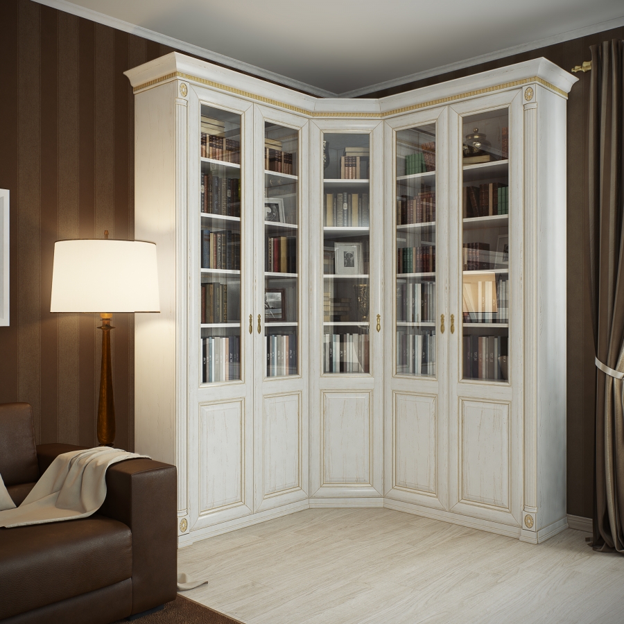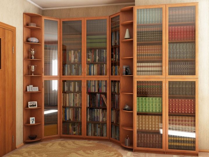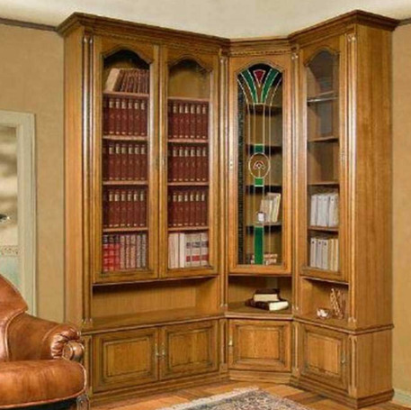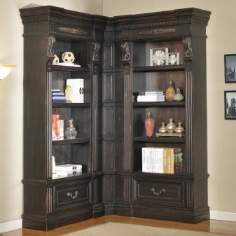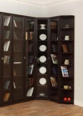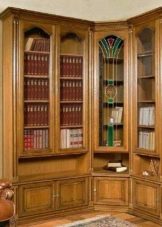 Türen an den Eckregalen können beliebig nummeriert werden. Meistens gibt es zweitürige oder trikuspidale Modelle. Dies sind mittelgroße Schränke, in denen Sie jedoch alle Bücher in das Haus legen können. Über den Türen befindet sich oft eine dekorative Rosette. Hervorragende Designs und Schnitzereien machen solche Schränke zu einer echten Heimdekoration.