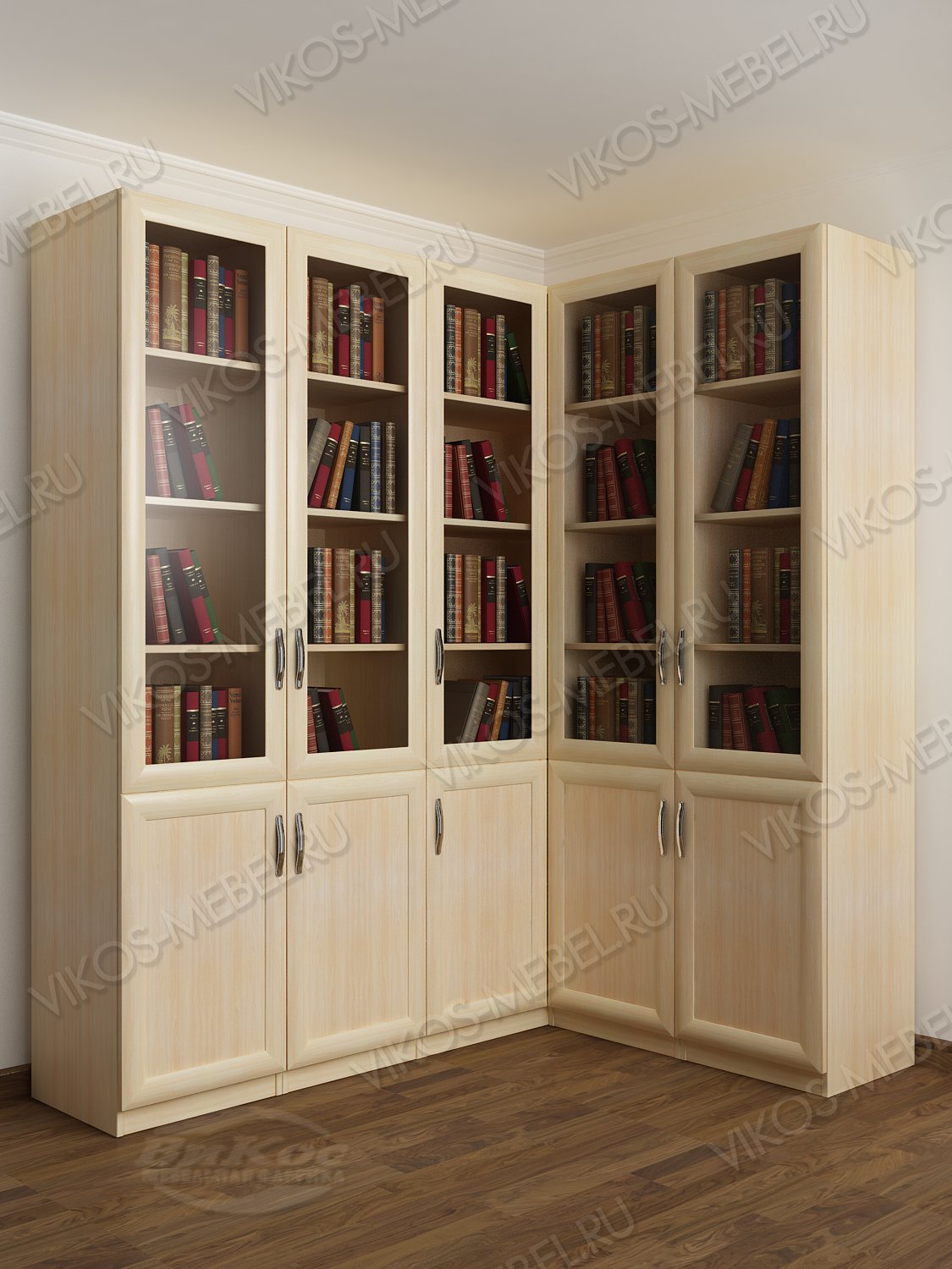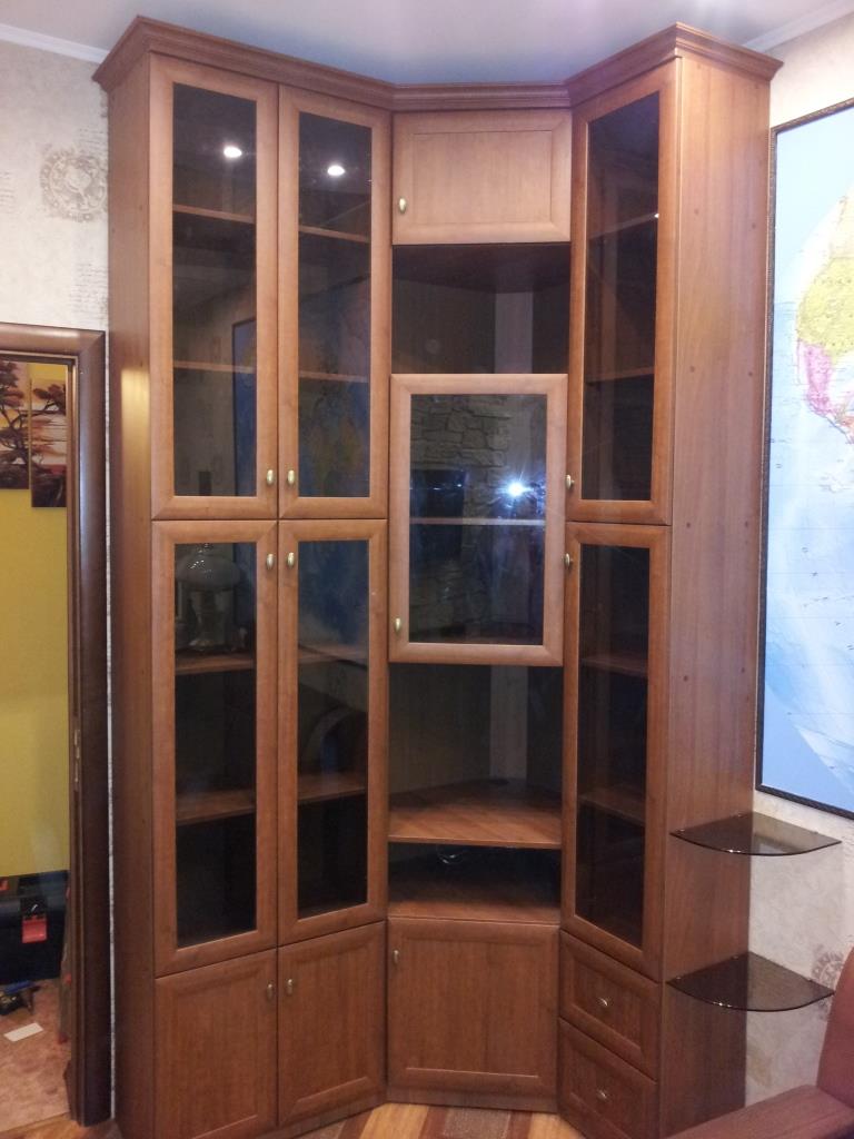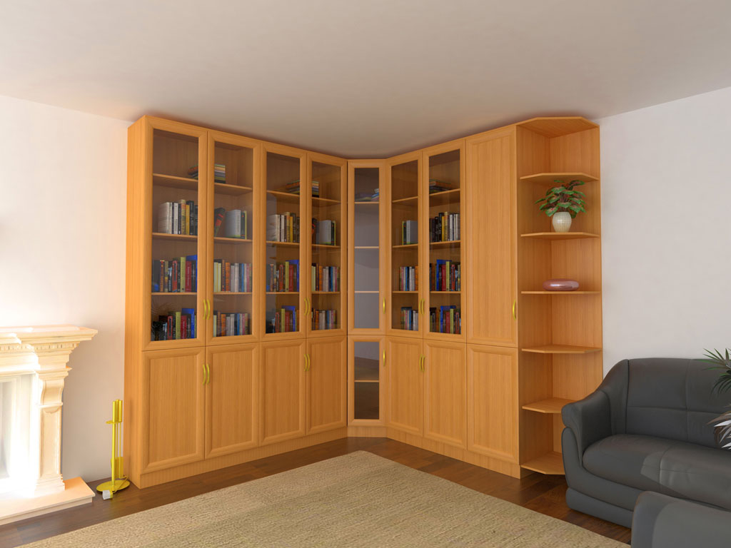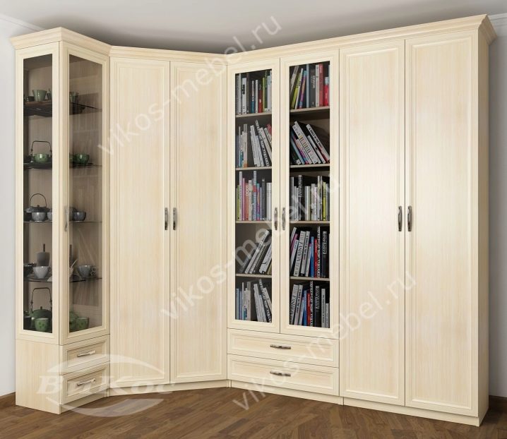 Türen an den Eckregalen können beliebig nummeriert werden. Meistens gibt es zweitürige oder trikuspidale Modelle. Dies sind mittelgroße Schränke, in denen Sie jedoch alle Bücher in das Haus legen können. Über den Türen befindet sich oft eine dekorative Rosette. Hervorragende Designs und Schnitzereien machen solche Schränke zu einer echten Heimdekoration.