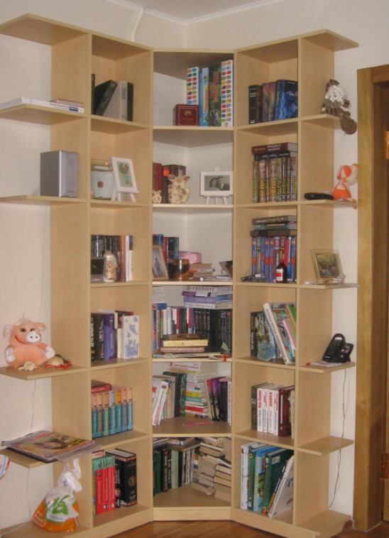 Für den Alltag können Sie aber auch Modelle von Eckregalen aus hochwertiger Span- oder Sperrholzplatte wählen. Sie sind den Möglichkeiten der Schönheit in Holz nicht unterlegen, aber erschwinglicher. Außerdem sind diese Modelle transportabler, weil sie weniger wiegen.
