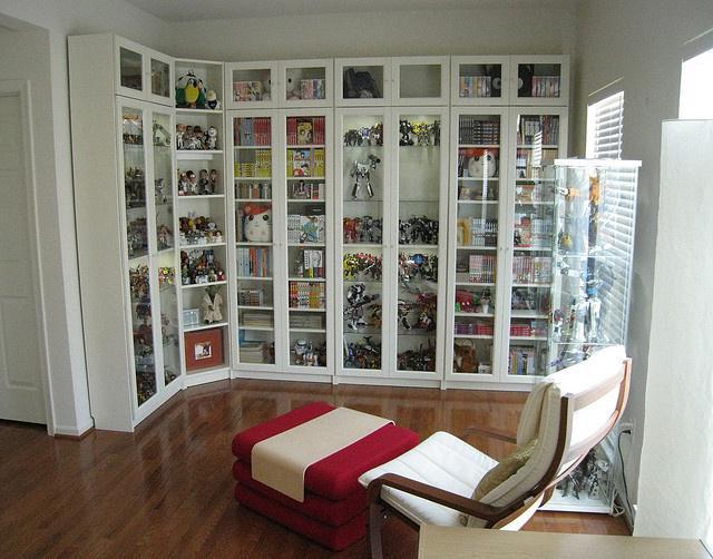 Wenn es einen Wunsch gibt, eine bestimmte Literatur zu demonstrieren, dann wird ein offener oberflächlicher Schrank auch einen Vorteil haben. In Bibliotheken von wohlhabenden Menschen und Mitgliedern der Elite kann oft festgestellt werden, dass alle Bücher von einem Verlag und im selben Stil hergestellt werden. Low-Key-Uni-Abdeckungen sehen luxuriös in Bücherregalen.
