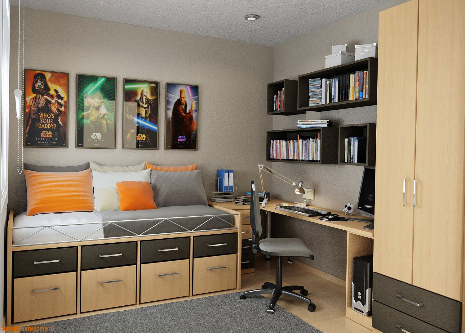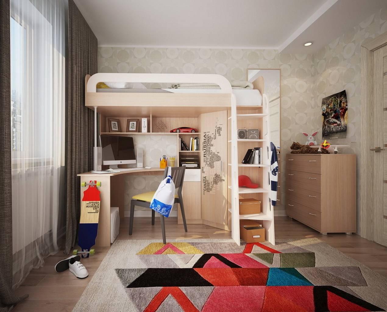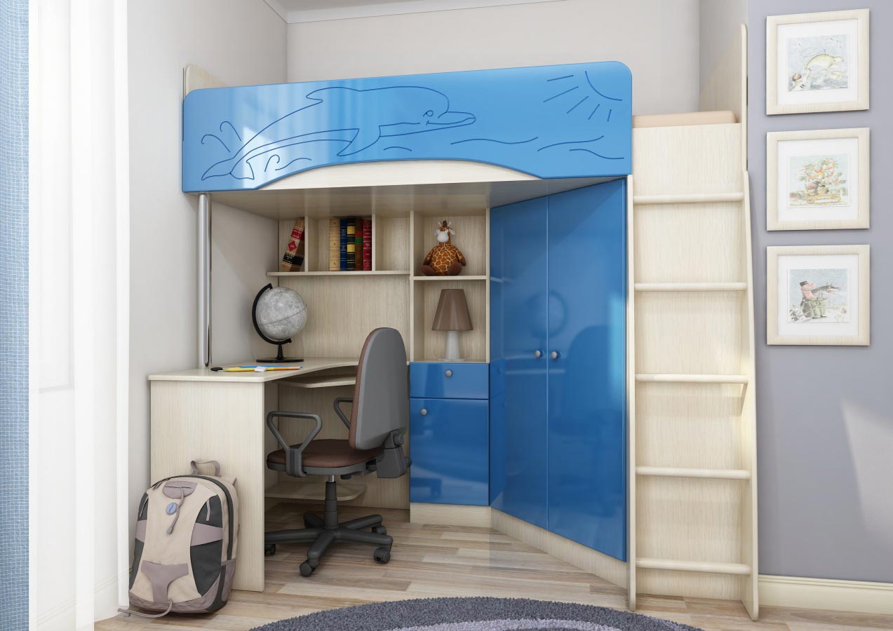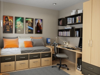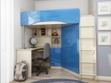 Eine Ecke für einen Schuljungen mit einem Kleiderschrank passt gut nicht nur in einen separaten Raum, sondern auch in den Teil, der im Gemeinschaftsraum zugeteilt ist. Dies kann das sogenannte Hochbett sein, dessen obere Etage ein Schlafplatz ist und darunter ein Tisch. Der Schrank kann auch unter der Leiter an der Seite der Struktur sein.