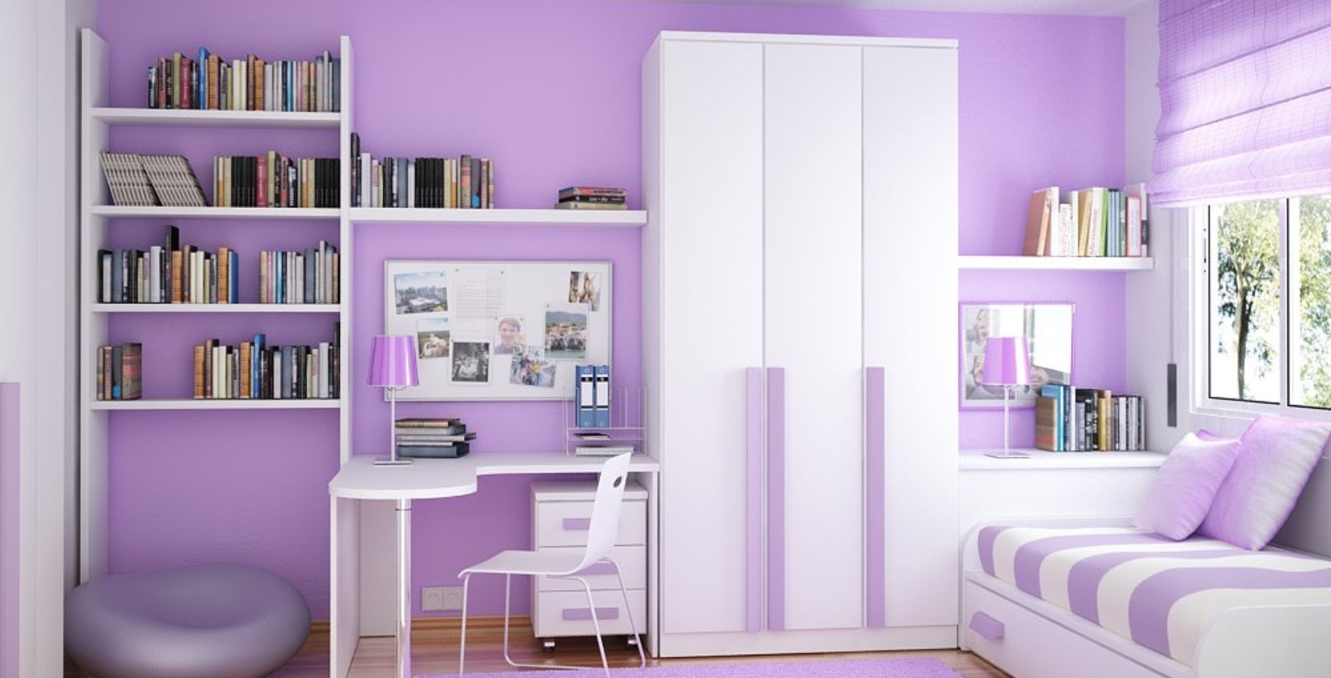 Für ein Teenager-Mädchen, raffinierte und elegante Möbel aus weißen und lila Farben tun. Geräumige Kleiderschränke ermöglichen es, die Garderobe einer Fashionista bequem zu ordnen und ein gut organisierter Arbeitsplatz muss produktiv lernen.
