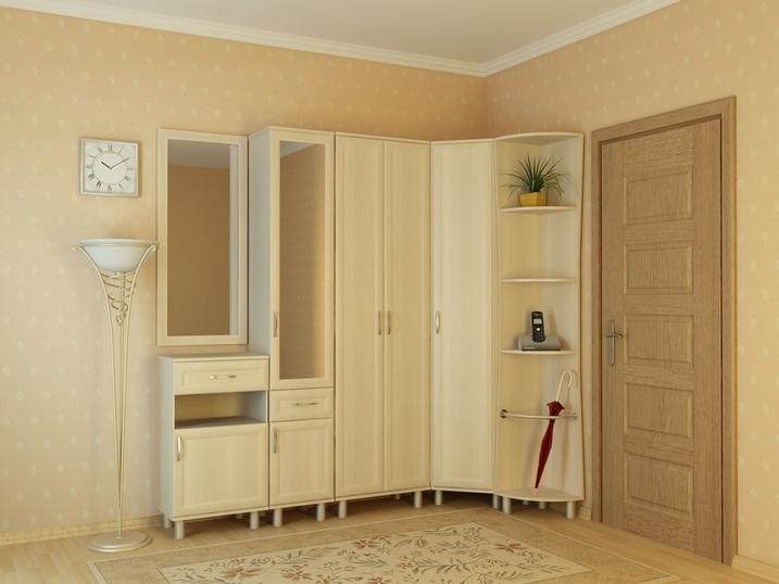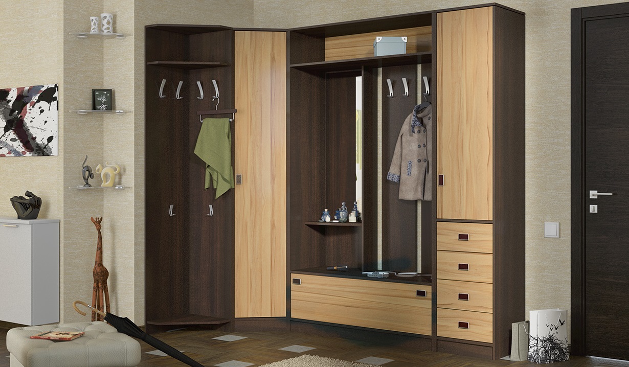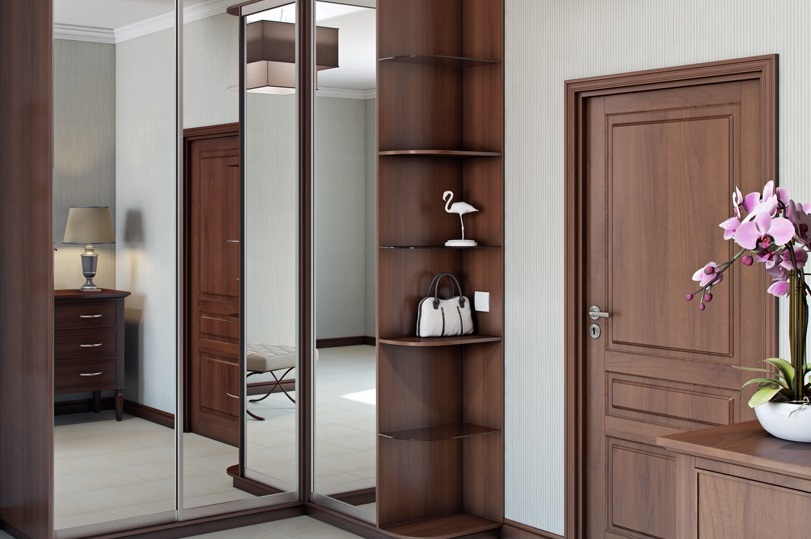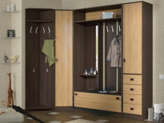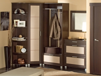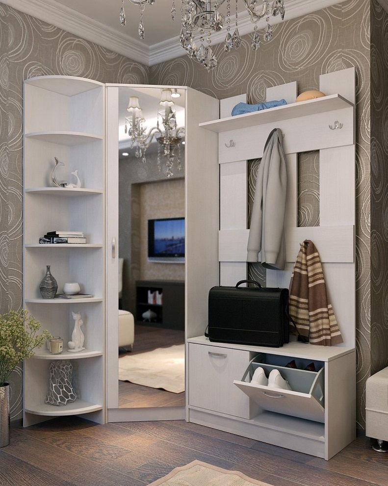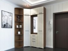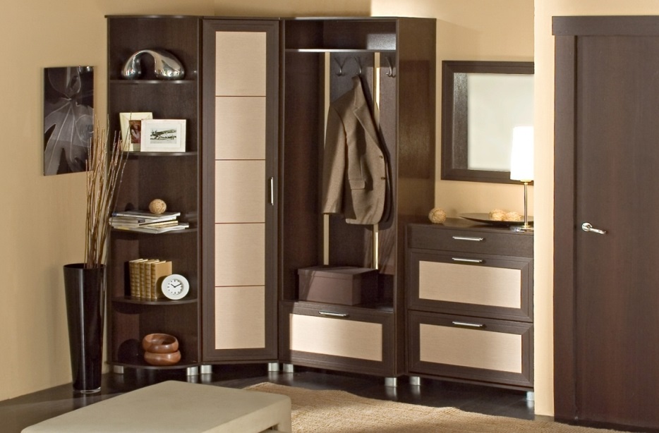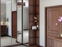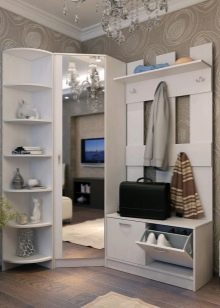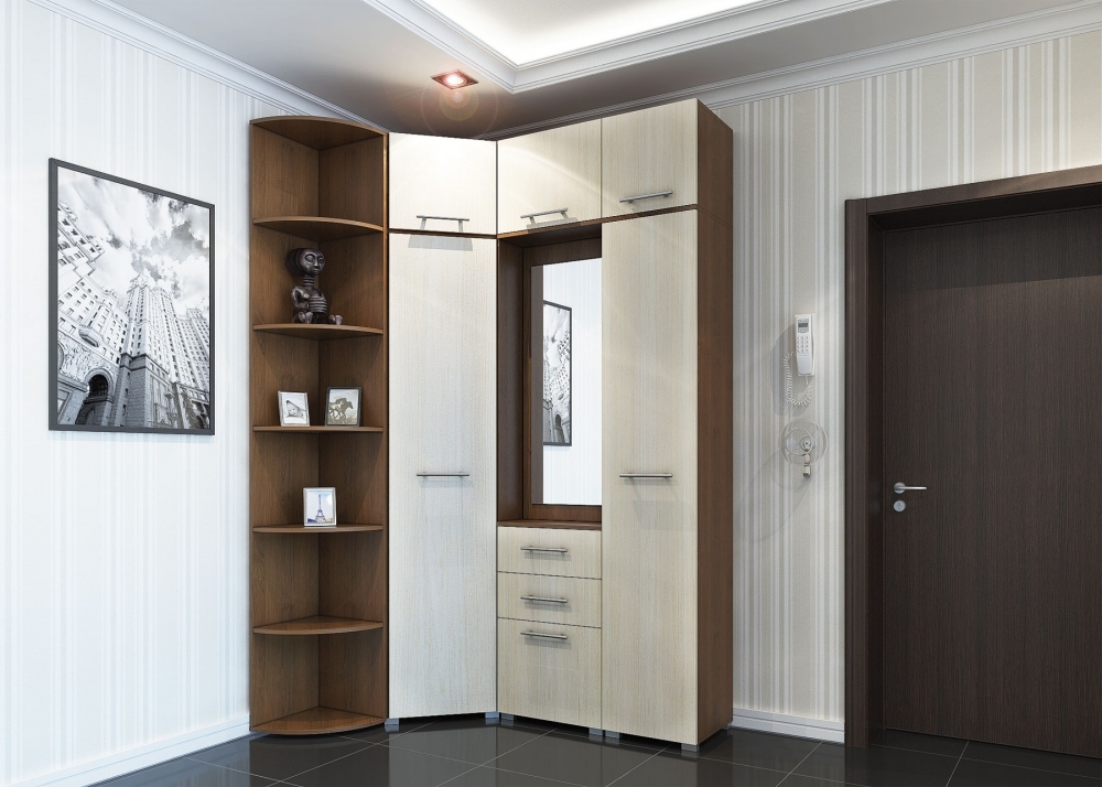 - Ecke. In einem kleinen Raum des Flures passt ein schmaler Eckschrank Option. In einer Ecke bleibt der Rest des Raumes frei. Oft gibt es einen Spiegelschrank des Eckmodells. Die am häufigsten verwendete Konstruktion mit einem Eckelement und zusätzlichen Abteilen an den Seiten.