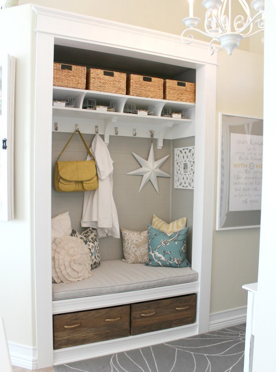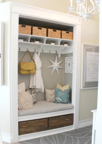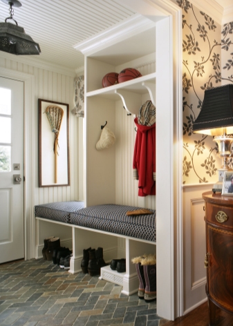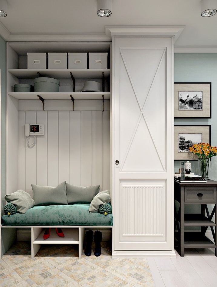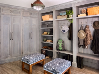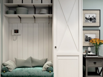 Ein Einbauschrank in einer Nische kann komplett offen sein, aber dann kann fast alles, was im Flur benötigt wird, eingebaut werden. Dies ist ein Ort für Kleidung und Schuhe, es gibt einen bequemen Sitz, um sich zu setzen und die Schuhe zu wechseln. Nichts mehr, aber alles ist sehr bequem und schön.
