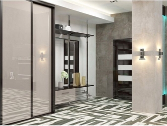 - Hightech Als eine Variante des Minimalismus ist dieser Stil durch den Mangel an Dekor, Funktionalität gekennzeichnet. In dieser Richtung nehmen Möbelstücke ein Minimum an Platz ein. Es kann einen kontrastierenden schwarz-weißen Flur mit Elementen aus Glas und Holz geben.