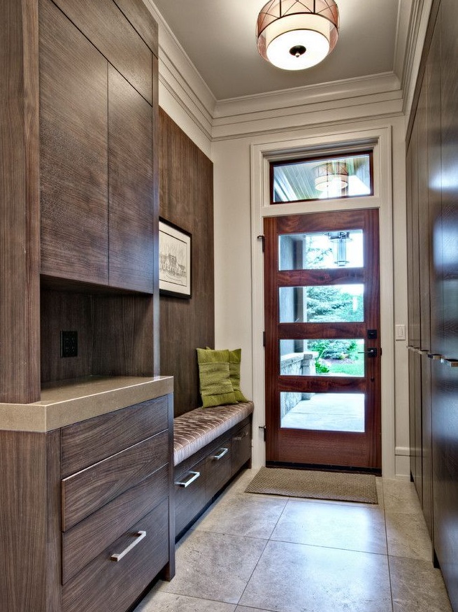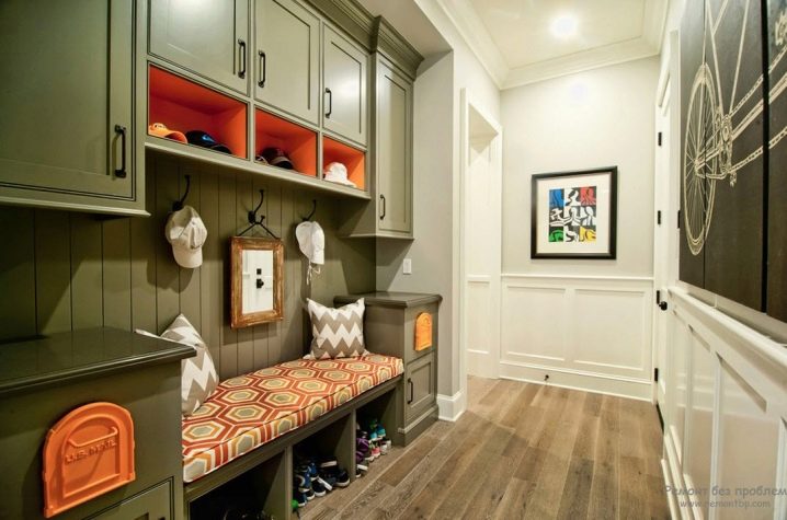 Im Flur, wo die Farbe der Decke und der Wände in dunklen Farben gehalten ist, sehen helle Möbel besser aus, zum Beispiel in beige, massiv, aschfahl, Kaffeegeschirre. Für Wohnungseigentümer, die solche Farben für übermäßig langweilig halten, sind helle Farben für Möbelschränke möglich.Zum Beispiel ein Olivenschrank in einem kleinen Flur.