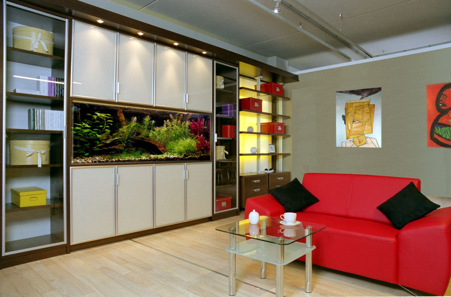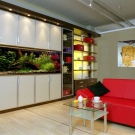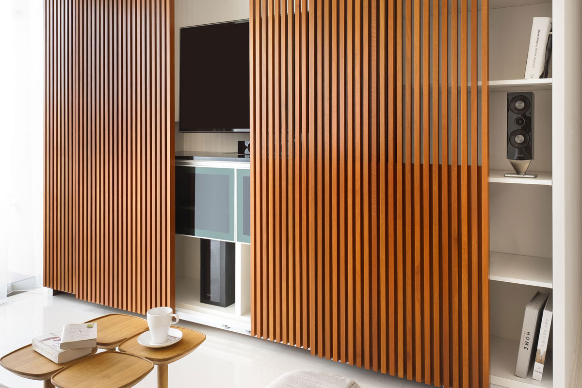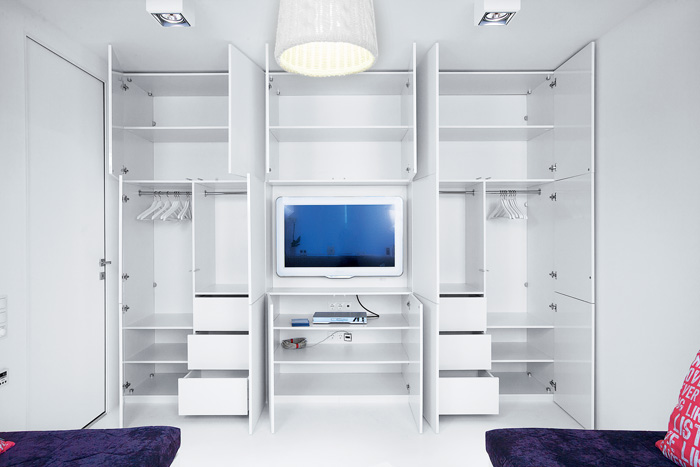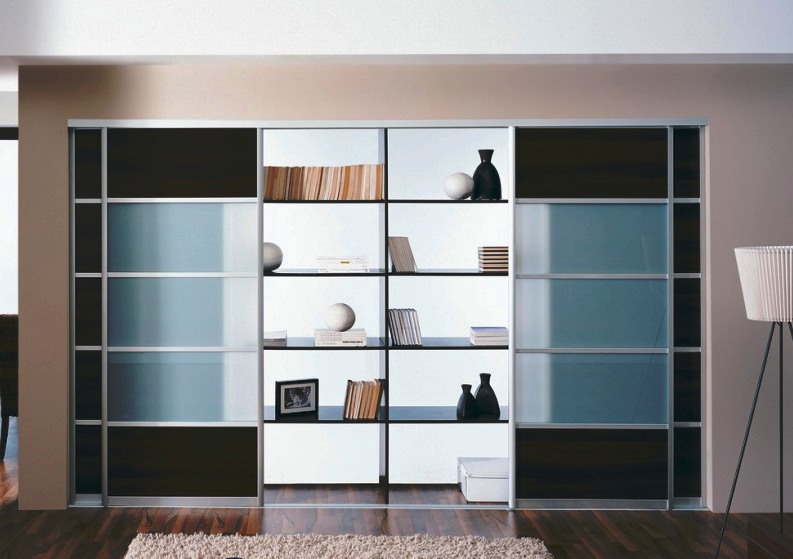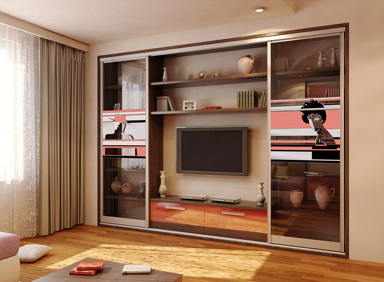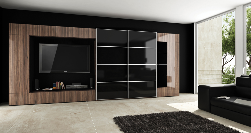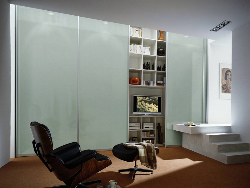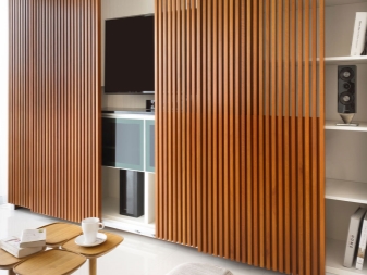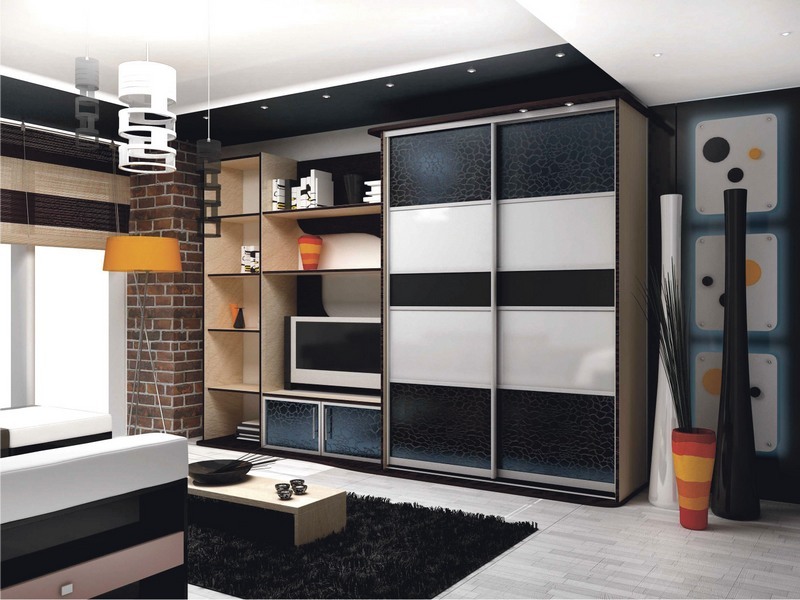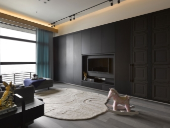 Da das Kabinett die gesamte Wand einnehmen wird, wird die ganze Aufmerksamkeit darauf gerichtet sein. Dies bedeutet, dass es entweder hinter Schiebetüren versteckt sein muss, mit einem interessanten Muster verziert sein muss, oder offene Regale haben, wo Sie dekorative Details arrangieren oder die Ausrüstung installieren können, die Sie brauchen.