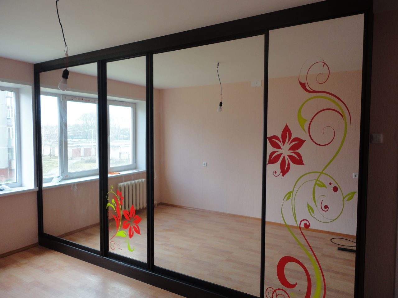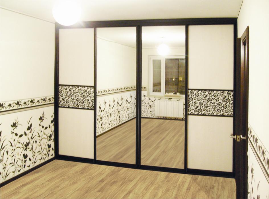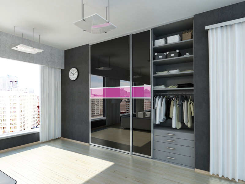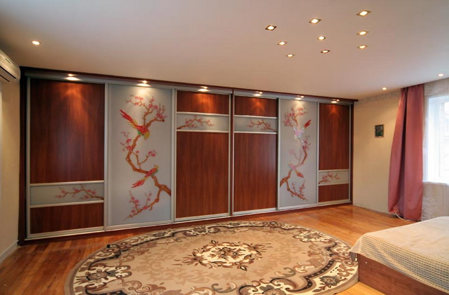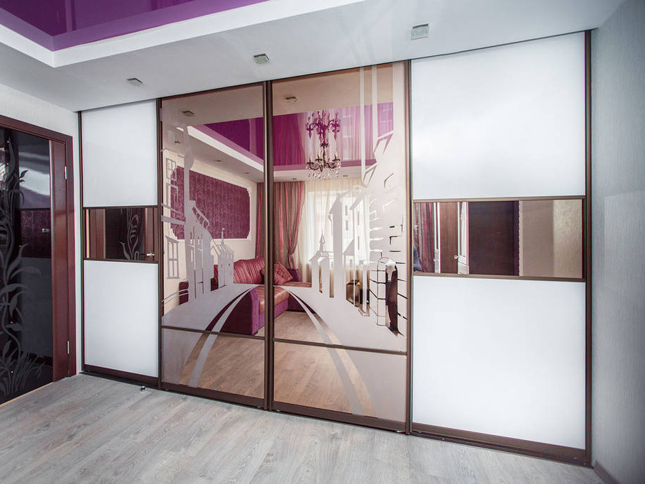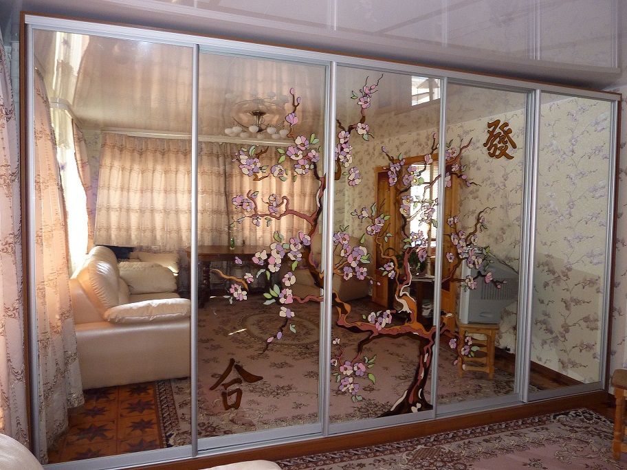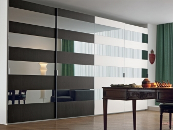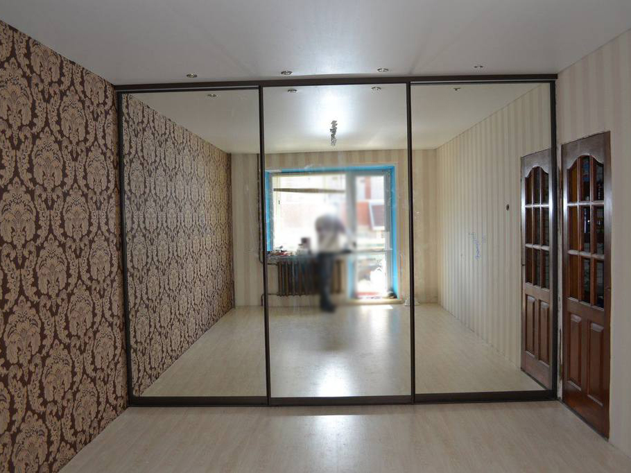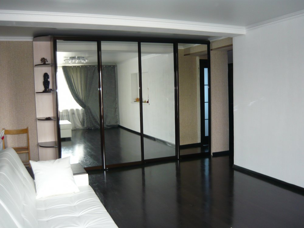 Schiebeschränke mit Spiegeltüren sind sehr beliebt.Spiegel kann die Oberfläche von nur einem Blatt oder alle auf einmal sein. Im zweiten Fall erhalten Sie eine voll reflektierende Wand, die sehr beeindruckend aussieht. Die Hauptsache, vergessen Sie nicht, regelmäßig den Spiegel zu wischen.