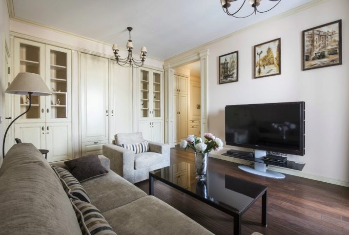 Möbel, die die gesamte Wand einnehmen, machen den Raum nicht kleiner, im Gegenteil, durch die Installation eines solchen Schranks werden Sie beginnen, Ihren freien Platz rationeller zu nutzen. Schließlich sind in der Regel keine Möbel in der Nähe der Schränke im Wohnzimmer installiert und der Raum ist einfach leer. Und wenn Sie den gesamten Platz in einem kompakten Schrank einnehmen, hilft Ihnen diese Methode, den zusammengesetzten Raum zu speichern.