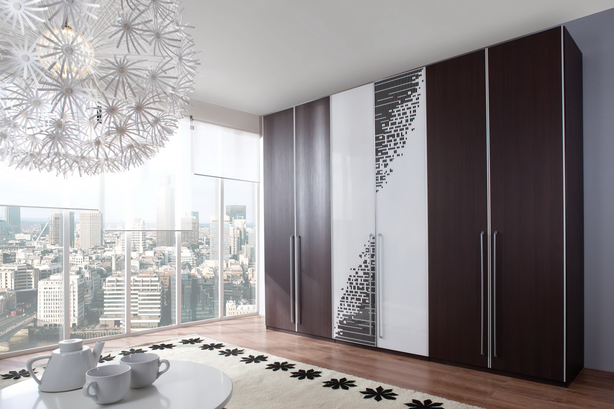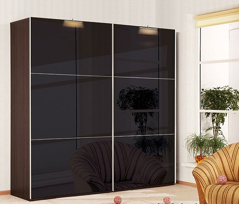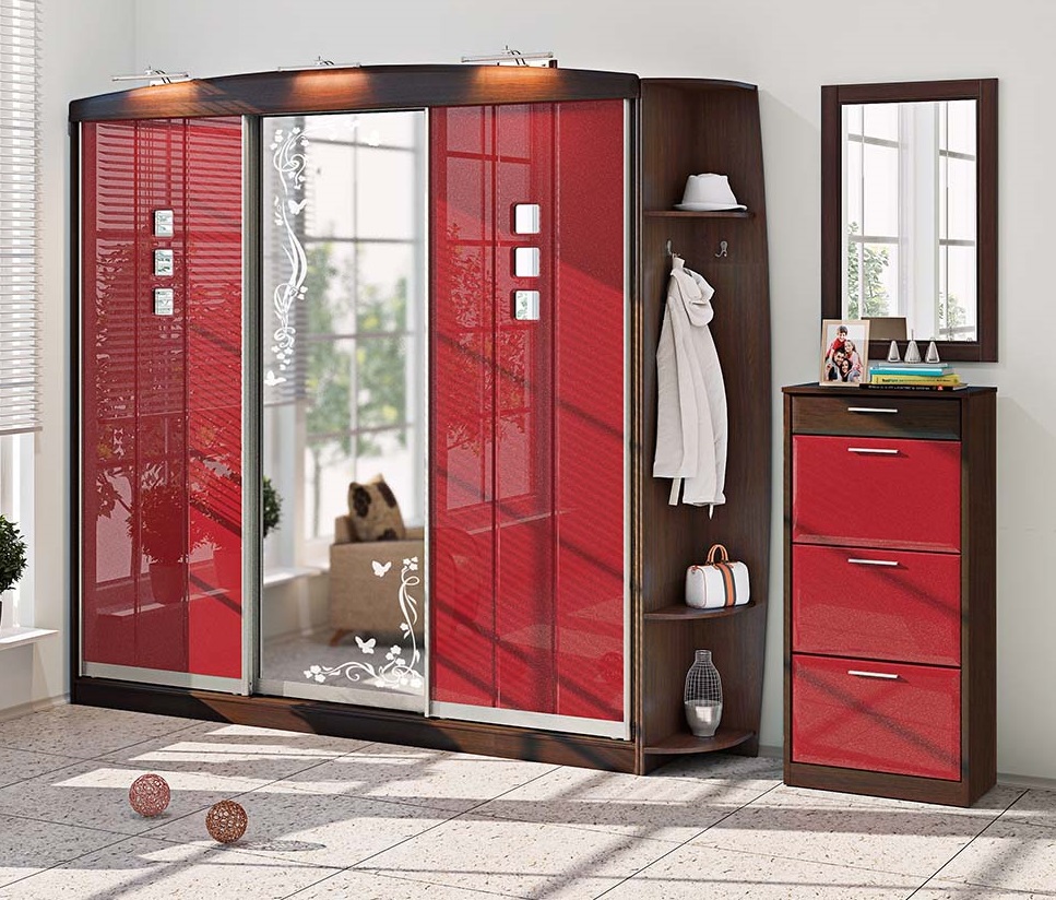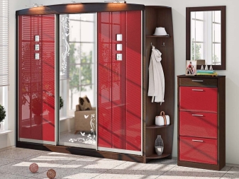 Sehr diskreter moderner Stil. Hi-Tech "liebt" die richtige Form, Symmetrie, klare Ecken. Die Garderobe im "High-Tech" -Stil kann sowohl eingebaut als auch komplett sein. Seine Oberfläche sollte glatt sein. Bei der Ausrüstung sollten glatte Oberflächen aus Kunststoff, Metall, Glas und Spiegel bevorzugt werden. Wenn die Fassade aus MDF oder Massivholz besteht, sollte sie perfekt poliert und immer mit z. B. Kunststoff- oder verchromten Metallgriffen versehen sein. Wenn Sie einen Platz zum Aufbewahren von Dingen haben, können Sie eine dekorative Glasvitrine in das Wohnzimmer stellen, die ihren Inhalt jedem zeigt.