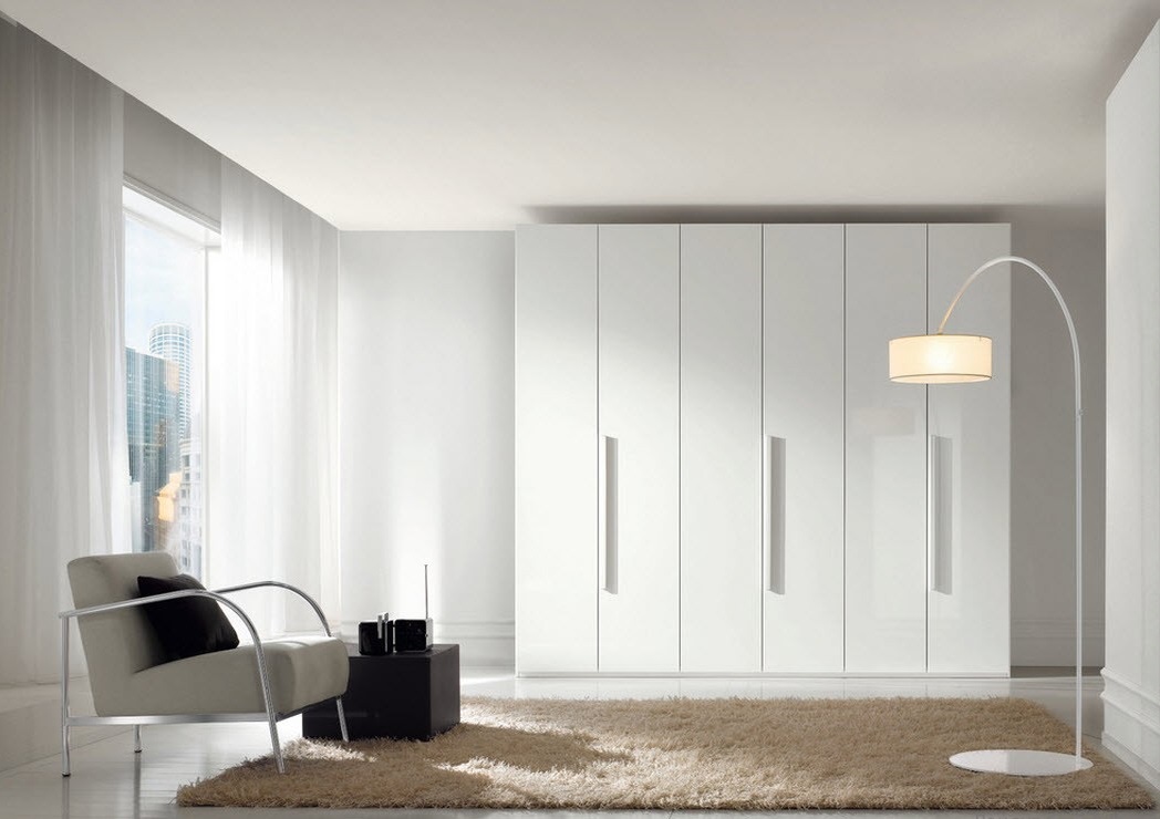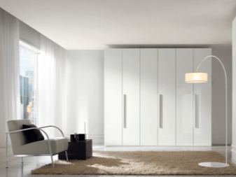 Minimalismus zeichnet sich durch extreme Offenheit von Formen, Materialfestigkeit, klare Geometrie aus. Um sich vor den Augen all der zusätzlichen Dinge zu verstecken, setzt man normalerweise einen großen Kleiderschrank. Ideal für diesen Stil - Einbauschrank, der so mit der Wand verschmilzt, dass es nicht schien. Neben Schiebetüren können auch Falttüren verwendet werden.