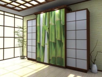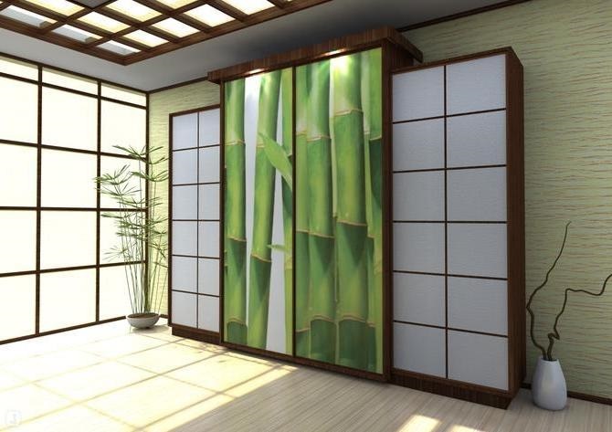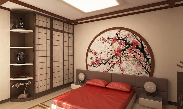 In diesem Schlafzimmer im japanischen Stil passt eine moderne Garderobe perfekt. Es hat auf einer Seite offene, abgerundete Regale und auf den Fassaden eine Imitation von Reispapier. Ein solches Design verbirgt im Allgemeinen die Anwesenheit des Schrankes im Raum.Es schafft die Illusion der Wand eines traditionellen japanischen Hauses.
