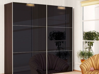 Für die Veredelung mit glattem Holz als Option - mit glänzender Oberfläche. Die Vorderseite des Gehäuses ist monophon oder zweifarbig, kontrastierend. Sehr oft, um den Raum mit großen Spiegeln an den Fassaden zu erweitern. Keine offenen Regale und Glastüren! In einem minimalistischen Interieur muss alles sicher verborgen sein.