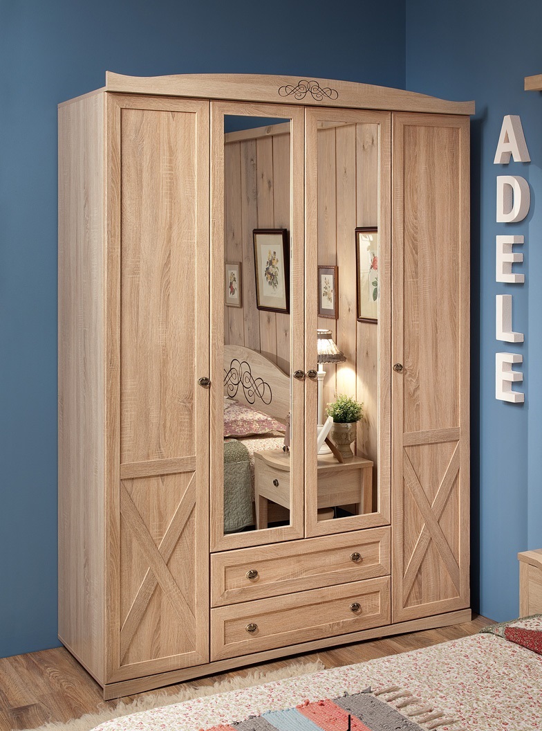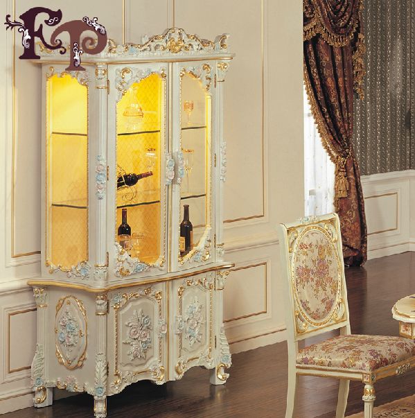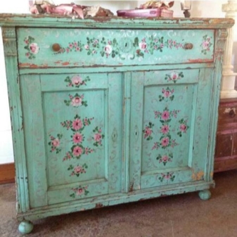 Für das Wohnzimmer oder Schlafzimmer können Sie ein ziemlich geräumiges Modell mit festen Fassaden wählen, aber immer mit Schnitzereien und geschmiedeten Griffen verziert.Möbelfarben sind hell: vorzugsweise weiß, blau, türkis. Patinamodelle sind für diesen Stil sehr geeignet.