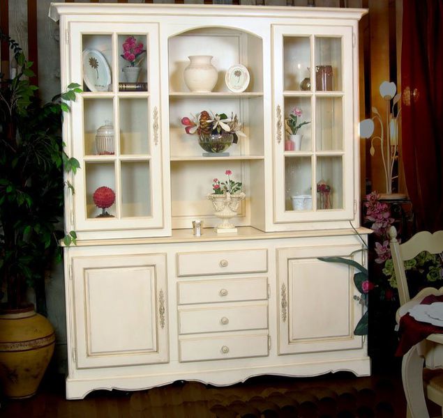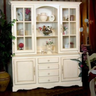 Der Stil des französischen Dorfes begrüßt auch die "alten" Möbel, obwohl dies nicht notwendig ist. Der Schrank sollte hell und ordentlich sein. Es ist normalerweise symmetrisch und hat die richtige Form. Dies ist in der Nähe der Möbel in einem klassischen Stil. Für die Küche ist die beste Lösung ein Schrank mit geschnitzten Details, Glastüren und Gittereinsätzen.