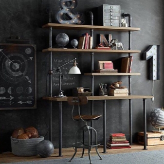 Modisch und beliebt heute kann Loft Interieur noch attraktiver gemacht werden, indem ein ungewöhnliches Rack im Geist des Steampunk gesetzt wird. Einfache Rohre und Bretter, die vor dem Hintergrund von "nackten" Wänden des Dachbodens die Rolle von Regalen spielen, werden mehr als logisch aussehen.