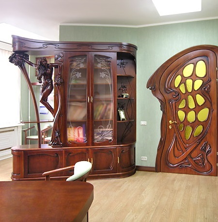 Schränke in diesem Stil zeichnen sich durch Eleganz und Eleganz aus. Die Weichheit der Formen, die verzierten Wendungen des Dekors sind sehr charakteristisch für diese Richtung. Modern ist eine Vielzahl von Formen.Ein Kleiderschrank für einen solchen Raum kann ein Schrank mit einem Schrank oben sein, ein offenes Bücherregal kann Baumästen ähneln. Ein weiteres Zeichen ist die Asymmetrie. Eine moderne Garderobe darf keine geraden und identischen Flügel haben, die eine Hälfte kann gerade, die andere Hälfte abgeschrägt sein usw.
