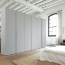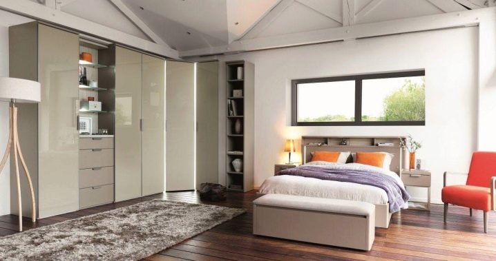 Es sieht interessant und diagonal oder Eckschrank aus. Dieses Design nimmt viel Platz in Anspruch, deshalb müssen Sie es in geräumigen Räumen installieren. Diese Art von Schrank kann viertürig oder dreitürig mit Schubladen sein. Es kann verwendet werden, um sowohl die Kleidung zu speichern, die Sie aktiv tragen, als auch um Kleidung außerhalb der Saison zu falten.