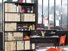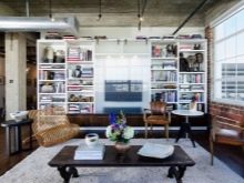 Im Wohnzimmer können Sie ein stilvolles Bücherregal im Stil eines Lofts installieren. Solche Möbel werden nicht nur eine gute Aufbewahrung für Ihre Bücher, sondern auch eine stilvolle Ergänzung des Interieurs. Sein Fenster kann mit allerlei Souvenirs, Statuen und anderen Details dekoriert werden.