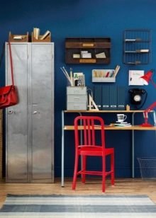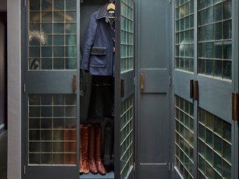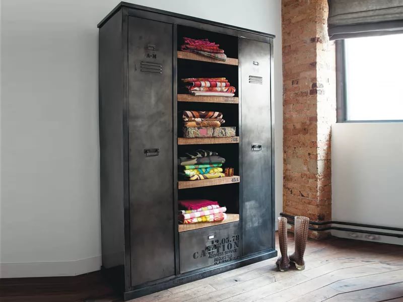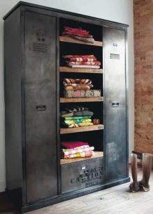 Ein breiter Schrank, der eine halbe Wand einnimmt, kann aus verschiedenen Materialien bestehen. Zum Beispiel wird die Metallbasis oft mit Regalen aus Holz oder Metallstangen ergänzt. Es sieht ziemlich stilvoll und interessant aus.