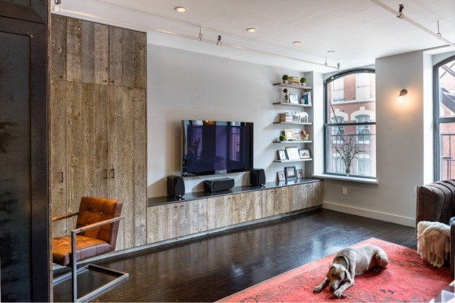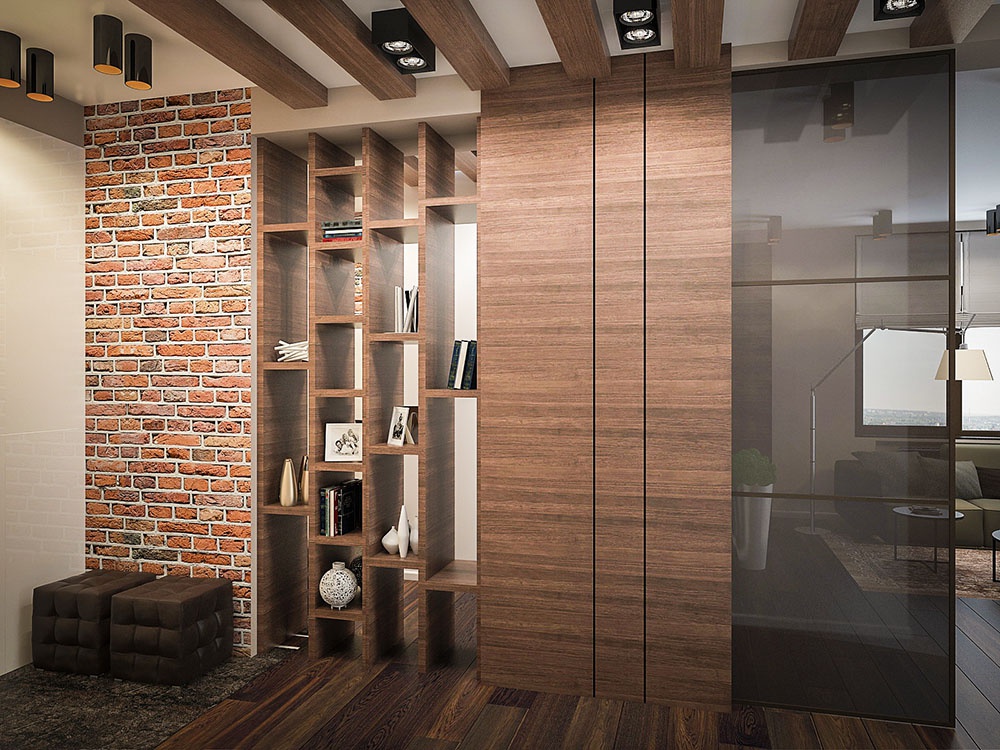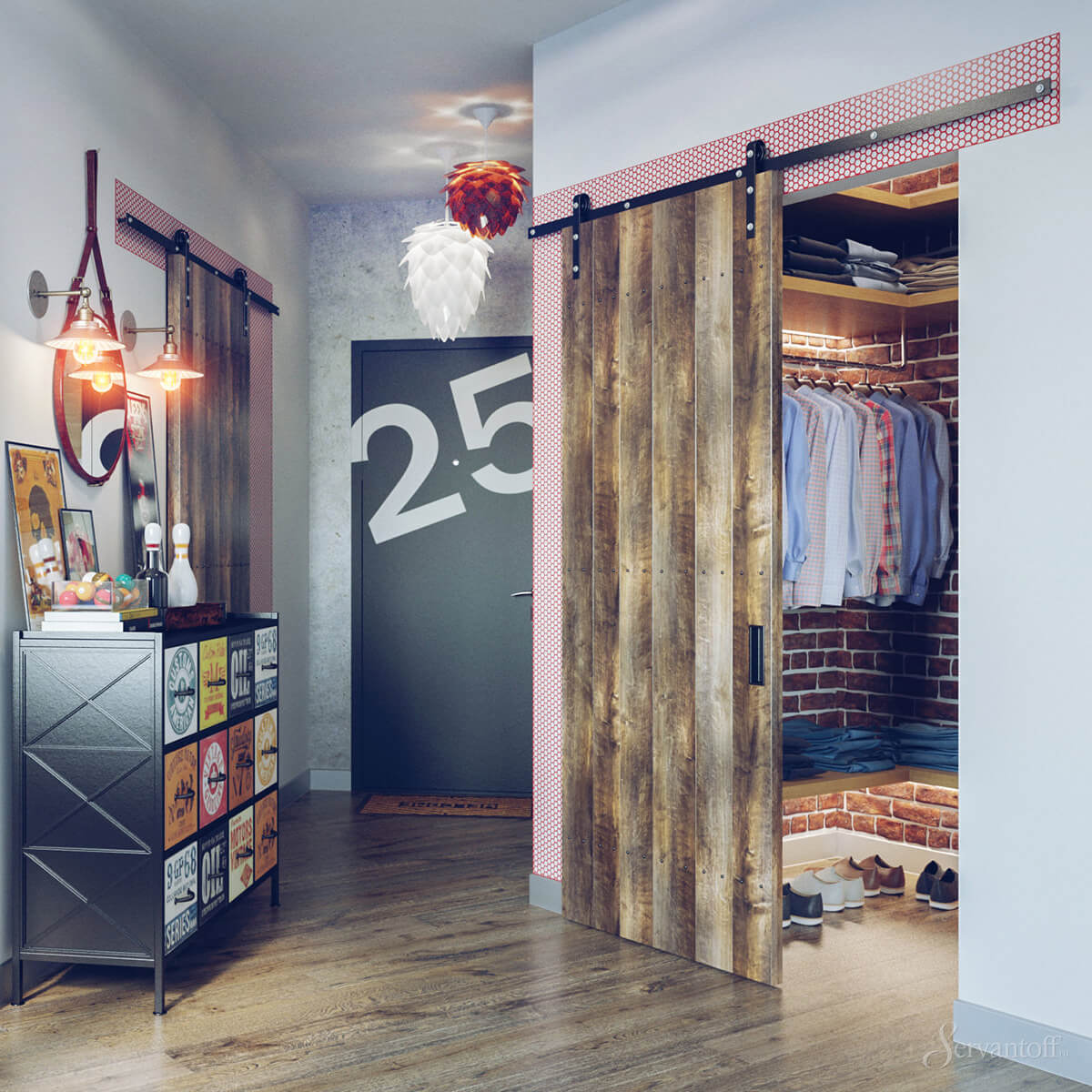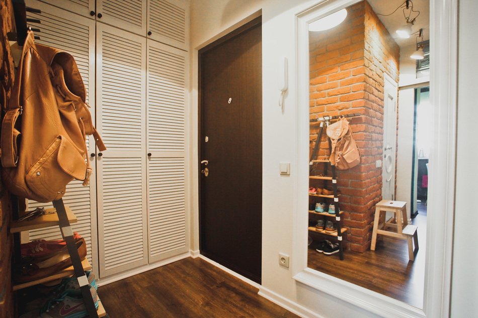 Die offensichtlichste und berechenbarste Möglichkeit ist die Installation im Flur. Der Korridor ist das, was alle Gäste zuerst sehen. Daher sollte es auch schön dekoriert sein. Loft-Stil Eingangshalle sieht stilvoll und modern aus. Es wird ein massiver Schrank sein.Stylisten empfehlen, Möbel mit strengen Formen aus grobem Material zu bevorzugen.