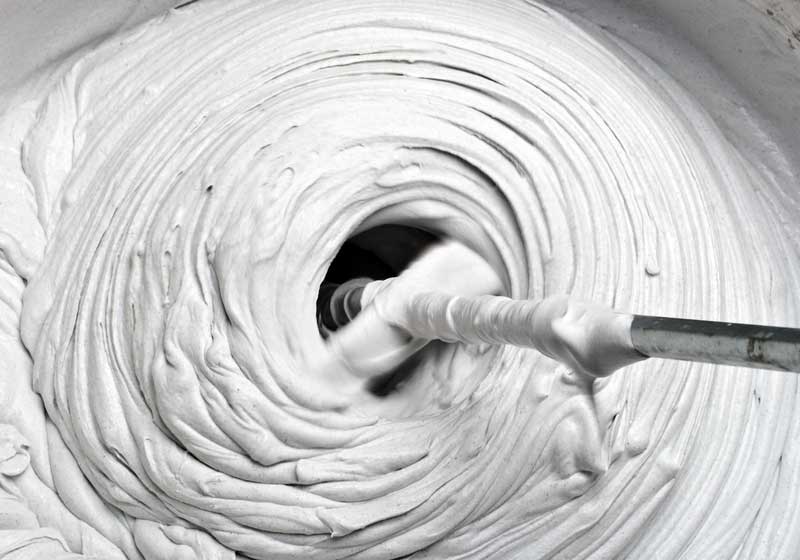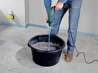 Um eine trockene Zementmischung aufzutragen, messen Sie die erforderliche Menge und legen Sie sie in einen Behälter, in dem Sie die Lösung vorbereiten.Nach und nach die benötigte Wassermenge zugeben und die Masse vorsichtig mit einer Mischdüse aufrühren. Mit der richtigen Vorgehensweise wird die Konsistenz der Paste erhalten. Lassen Sie die vorbereitete Zusammensetzung für 10 Minuten oder eine andere Zeit auf der Verpackung angegeben, um die Verunreinigungen vollständig aufzulösen, und rühren Sie erneut gründlich um.