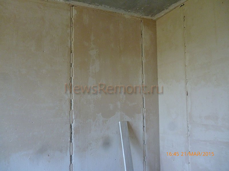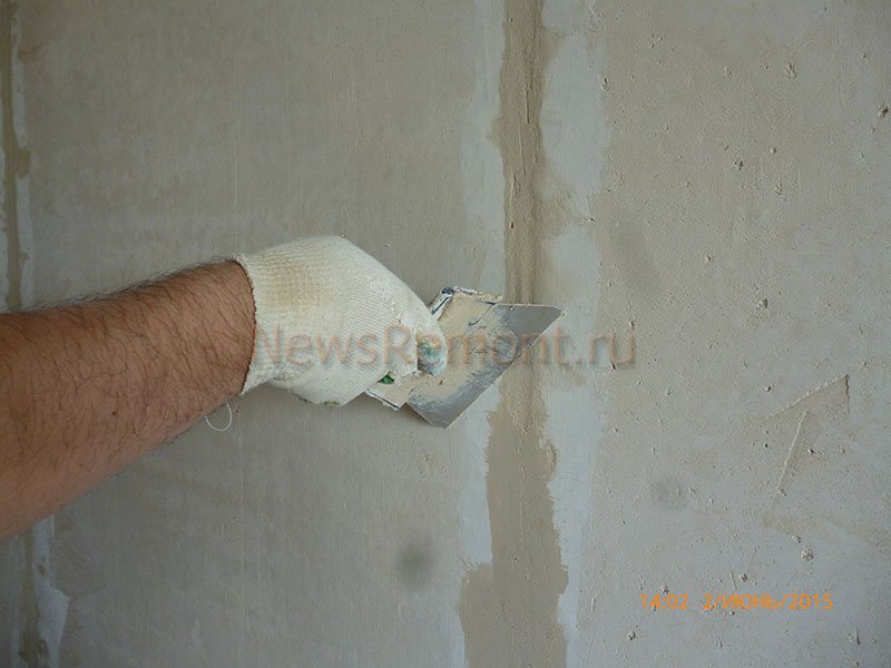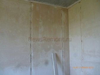 Nach der Anwendung die Startschicht zwischen den Beacons auch mit Hilfe der Regel herstellen. Dies ist viel einfacher, wenn zwischen den Vorrichtungen ein kleiner Abstand besteht. Um die Kittschicht so dicht wie möglich zu machen, brechen Sie den Prozess in bestimmte Phasen auf. Es ist besser, zuerst das Material in einem Abstand von einem halben Meter vom Boden an die Wand zu legen, dann können Sie in andere Bereiche weitergehen. Wenn Sie alles falsch machen, ist es gut möglich, dass der Kitt oben auf die untere Beschichtung fließt und die Oberfläche wird uneben sein.
