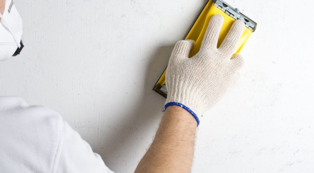 - Wenn der Kitt hart wird, treten in einigen Fällen merkliche Unebenheiten auf der Oberfläche auf. Um sie zu entfernen, verwenden Sie das Sandpapier, das auf der Stange befestigt ist. Bei aufgetragenem Kittmaterial kommt man fast nie ohne das Auftreten von kleinen Mängeln aus. Schleifen hilft, sie recht schnell und einfach zu beseitigen.