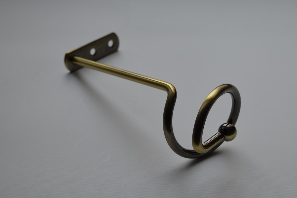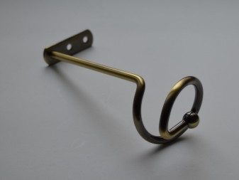 - Metallhalter ist eine der zuverlässigsten. Aufgrund seiner hohen Festigkeit kann es mit schweren Vorhängen verwendet werden. Geschmiedetes Element hat maximale Stärke. Eine solche Vorrichtung sieht wie ein Haken aus, an dem Haken aus verschiedenen Materialien hergestellt sind. Am beliebtesten ist die Farbbronze, die sich harmonisch in fast jedes Interieur einfügt.