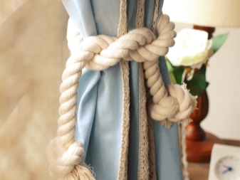 Sie können den Haken binden und häkeln. Gestrickte Sache fügt Komfort und Wärme dem Innenraum hinzu. Und um den Tonabnehmer noch origineller zu machen, hilft das Band, abgestimmt auf die Farbe der Vorhänge.