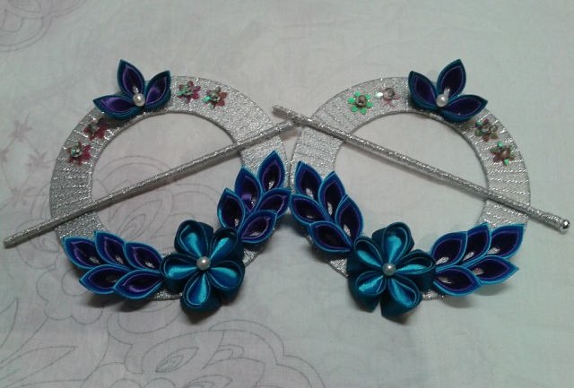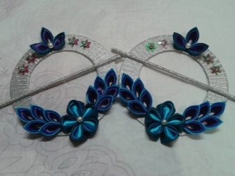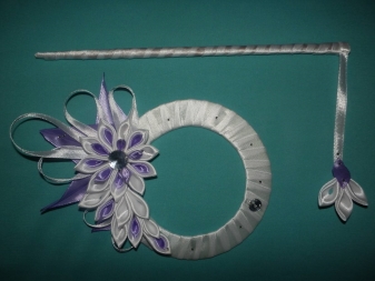 Um den Ring zu wickeln, wählen Sie ein passendes Band und fixieren Sie es mit Heißkleber. Sie benötigen auch eine Stricknadel oder einen Sushi-Stick, der ebenfalls mit Klebeband umwickelt ist. Blüten oder Blütenblätter in der Kanzashi-Technik schmücken das Design und machen es einzigartig. Sie können auch große Perlen oder künstliche Kunstblumen als Dekoration verwenden. Um das erhaltene Zubehör zu befestigen, genügt es, die Bahn in den Ring zu fädeln und die Stricknadel einzusetzen.