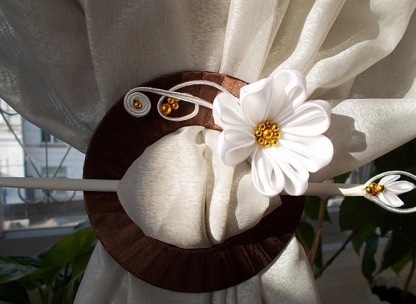 Ungewöhnliche und stilvolle Halter für Vorhänge können mit der Kanzashi-Technik hergestellt werden. Es ist nicht einfach, ein solches Zubehör herzustellen, aber das Ergebnis ist gerechtfertigt.