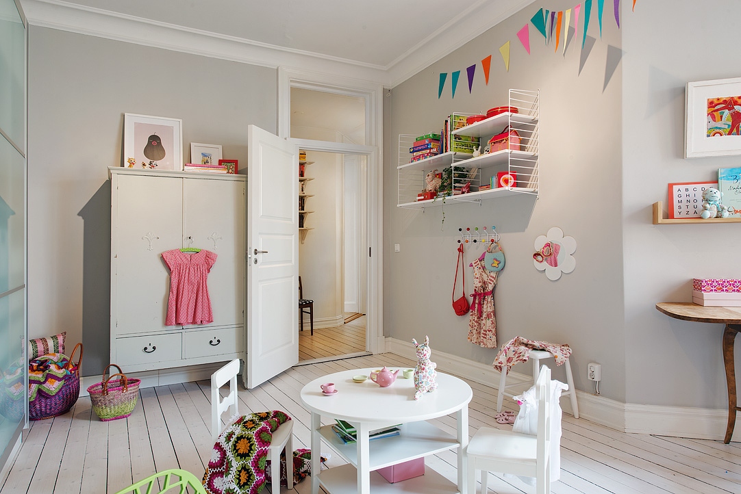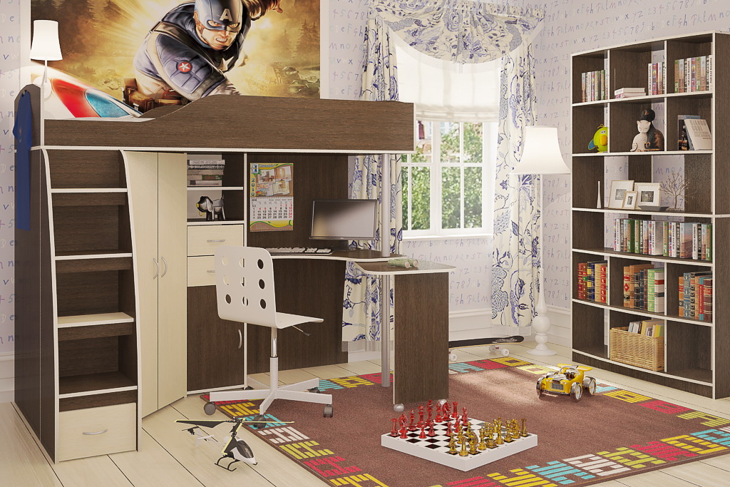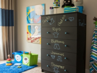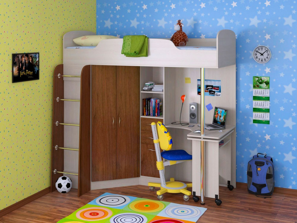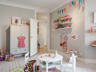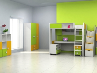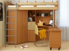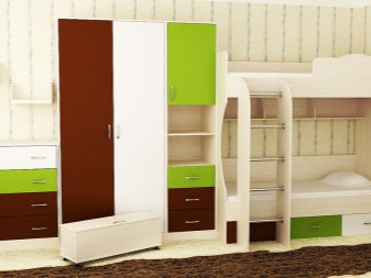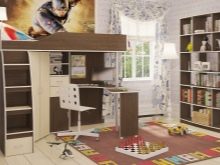 Fertige Modelle können einen anderen Satz von Regalen und Schubladen haben, so dass nur Eltern und ihre Kinder entscheiden, welche Anordnung zu ihnen passt. Diese Option eignet sich für die Installation in einem kleinen Raum, um wertvolle Meter zu sparen.