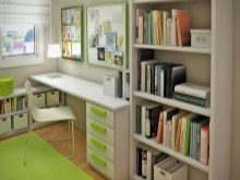 Wenn der Schlafbereich es erlaubt, können Sie einen separaten Schrank für Bücher und persönliche Gegenstände auf dem freien Platz installieren: Bastelsets, Figuren, Sammlungen usw. Jeder Schüler möchte sein Leben harmonisieren und persönliche Gegenstände, die an seinen Plätzen liegen, helfen ihm dabei.