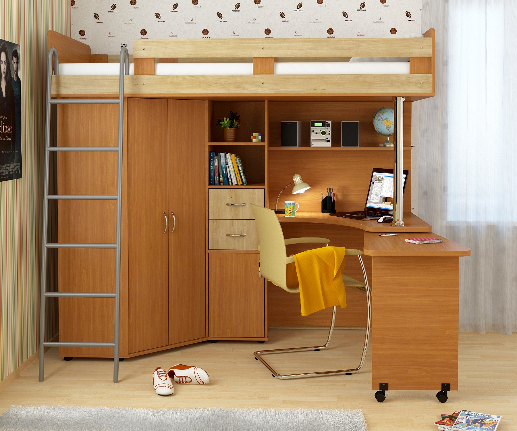 Der Ausgang aus einer schwierigen Situation kann ein Hochbett mit einem Arbeitsbereich und einem Bücherregal sein. Mit diesem Kit können Sie alle notwendigen Bereiche für den Schüler an einem Ort sammeln, um Platz zu sparen.