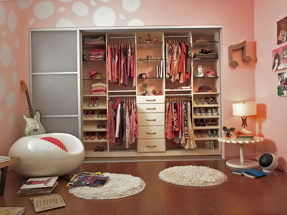 Fast jedes Mädchen träumt von einer großen Garderobe mit einer Menge schöner Dinge. Daher sollte der Schrank im Zimmer des Mädchens viele Regale und Schubladen haben, damit sich alle notwendigen Dinge darin befinden. Die Oberfläche der Struktur kann ein sauberes Muster oder ein feines Muster haben, das die Natur seines Besitzers personifiziert.
