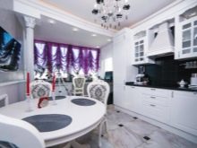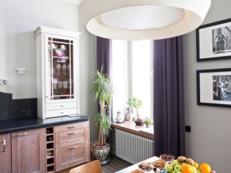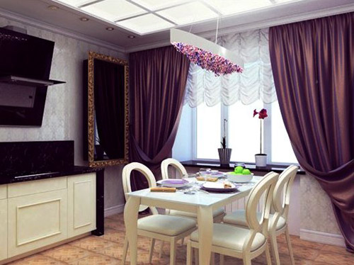 Einige Experten auf dem Gebiet der Psychologie glauben, dass ein Überschuss an Purpur eine negative Wirkung auf den Appetit hat. In dieser Hinsicht, für die Dekoration von Fenstern in der Küche ist es besser, die dunklen Vorhänge aufzugeben. Wenn das Zimmer in einem modernen Stil eingerichtet ist, können Sie Produkte aus hellen Stoffen in lila Farbe wählen. Auch geeignete Optionen mit einem rosa Farbton.