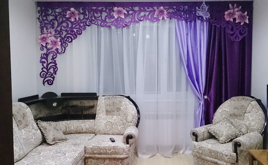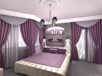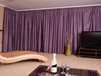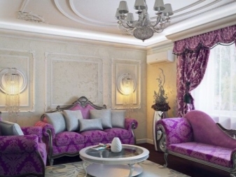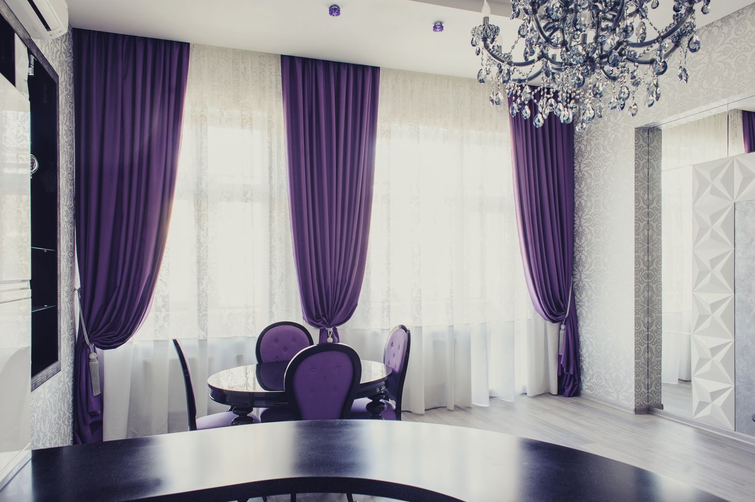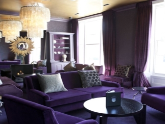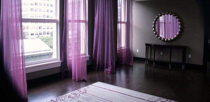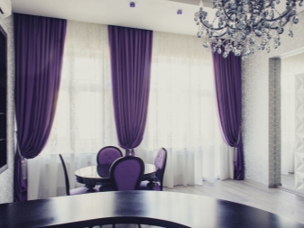 Violette Vorhänge eignen sich für Räume in verschiedenen Stilen. Für ein spezifisches Design werden ein spezifisches Farbschema, eine Textur des Gewebes, seine Länge und Dicke bereitgestellt.
