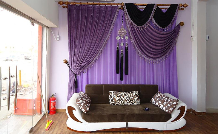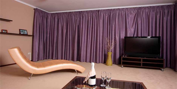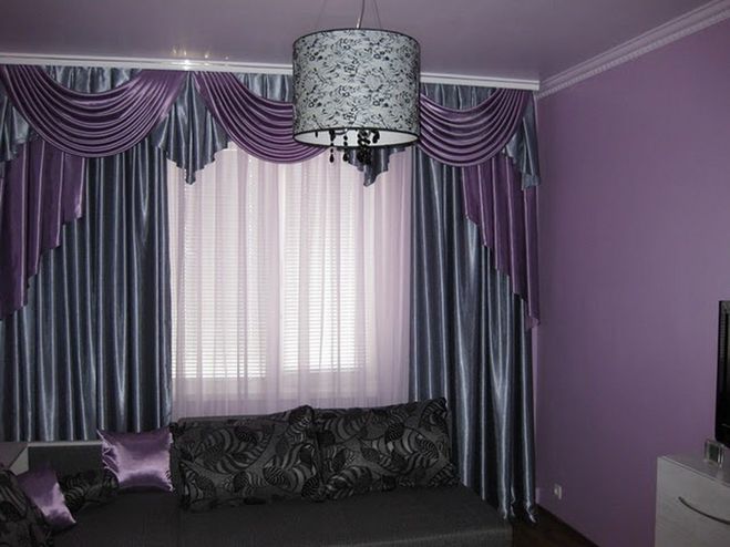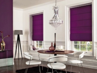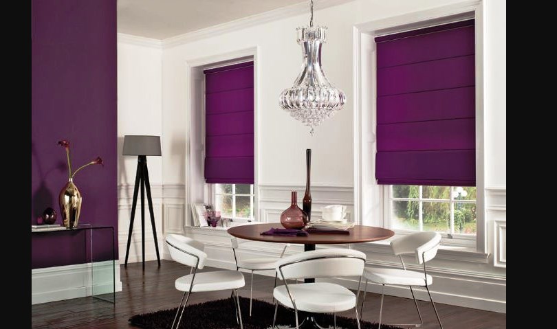 Trotz der Vorteile der Wahl und der Schönheit dieser Farbe,Es ist sehr wichtig, es nicht mit seiner Menge zu übertreiben. Designer merken das Alle Farben müssen in Temperatur und Sättigung ausgeglichen sein. Wenn sich der Raum auf der Sonnenseite befindet und es notwendig ist, den Weg der hellen Strahlen zu blockieren, ist die beste Wahl dunkelviolette dicke Rollos.