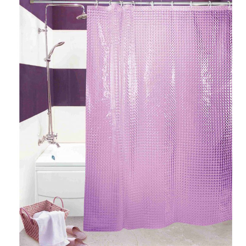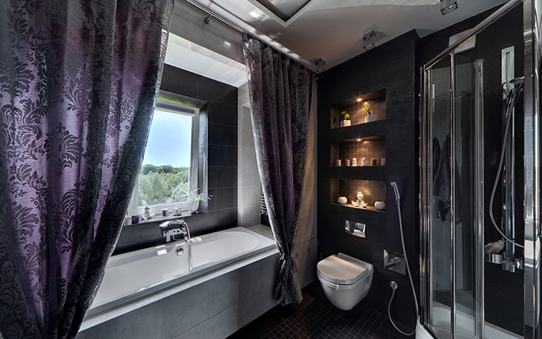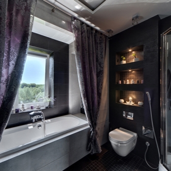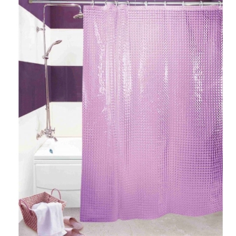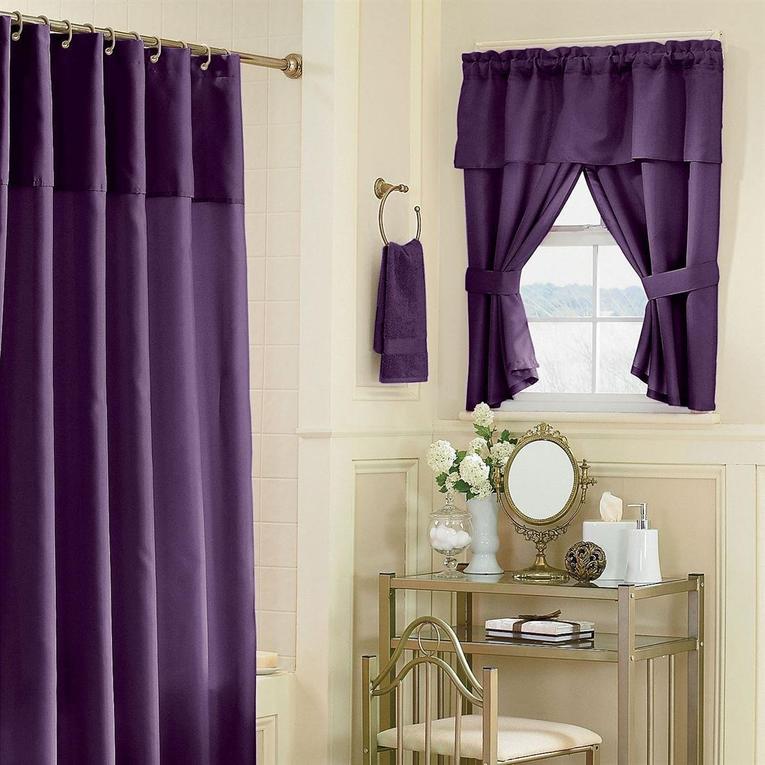 Nicht jedes Badezimmer hat ein Fenster, aber alle haben eine Badewanne. Lila Vorhang für sie wird eine bunte Dekoration im Raum sein. Diese Farbe wird den Raum verändern. Designer werden empfohlen, für die Zimmer Vorhänge in Lavendel oder lila-rosa Farbton zu wählen. Stellen Sie sicher, dass der Vorhang mit der Gesamtfarbe des Badezimmers kombiniert wurde.