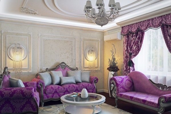 Gardinen und Vorhänge in violetten Farben wirken in den Sälen und Wohnzimmern luxuriös und stilvoll, besonders wenn sie im klassischen Stil dekoriert sind. Besonders schick wirken dichte Stoffe in dunklen Farben. Es ist erwähnenswert, dass dicke und tiefe Farben verwendet werden, um exquisite Dekore zu schaffen.